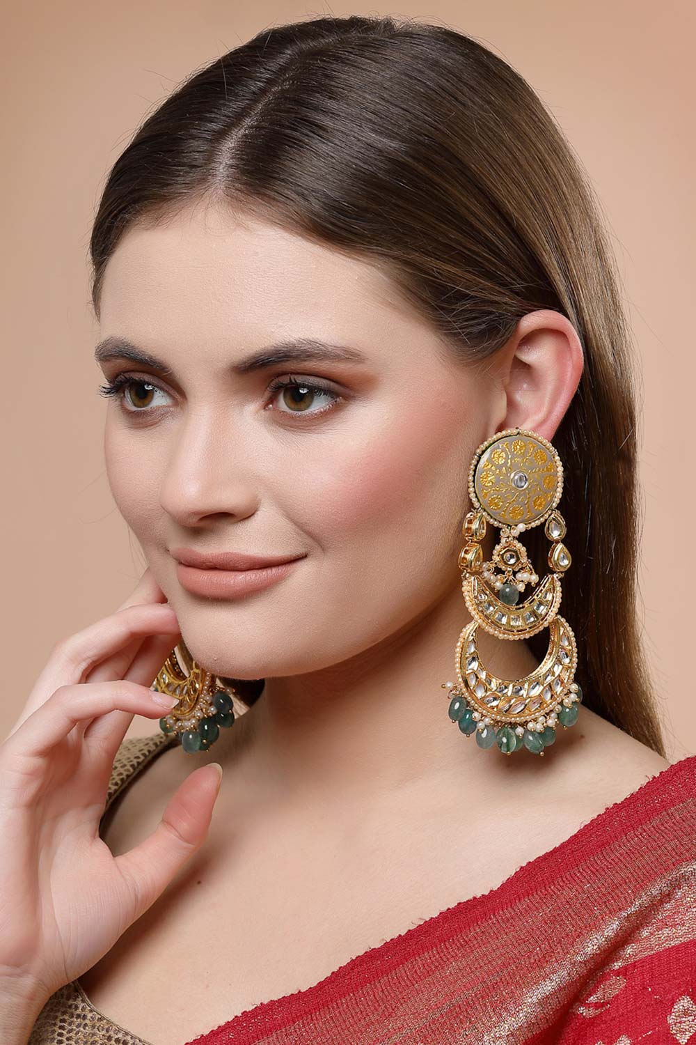 Green Gold-Plated Kundan And Pearls Drop Earring