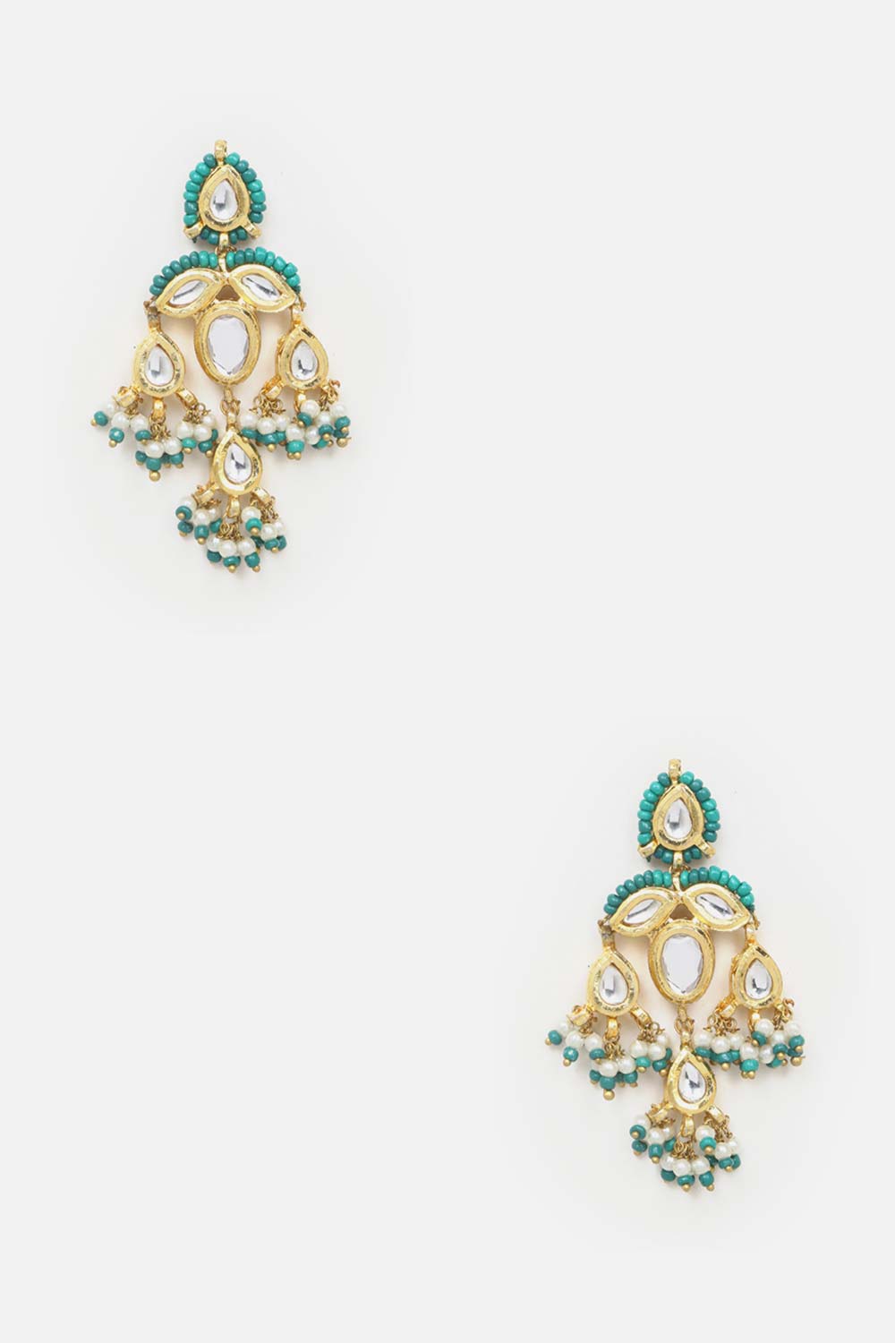 Green, White And Cream Drop Earring With Kundan And Pearls