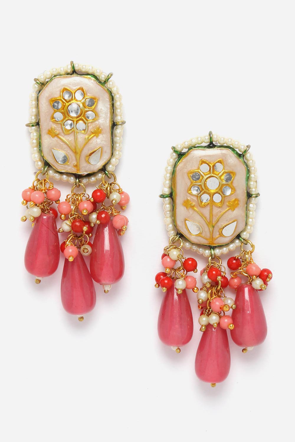 Peach And Pink Drop Earring With Kundan And Pearls