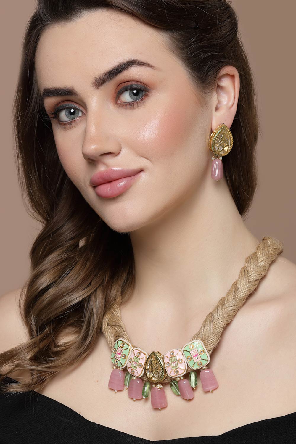 Pink And Gold Drop Earring With Kundan And Natural Stones