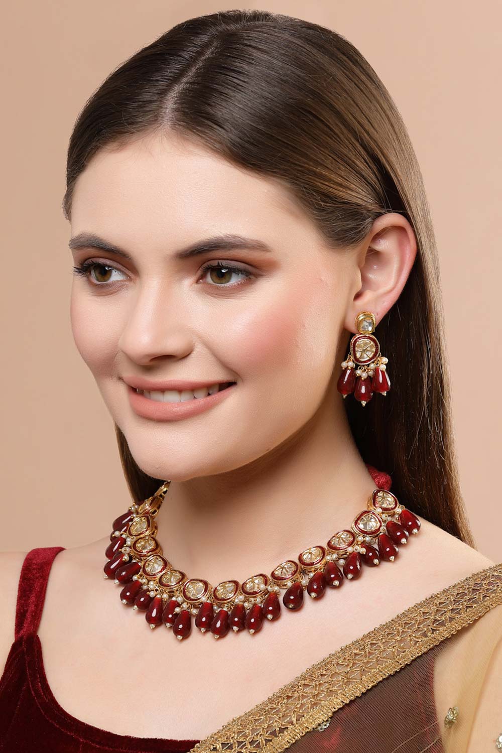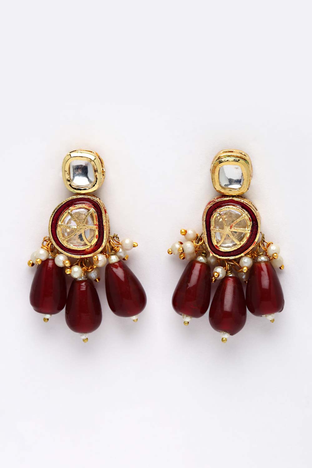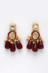 Red Gold-Plated Kundan And Pearls Drop Earring