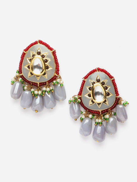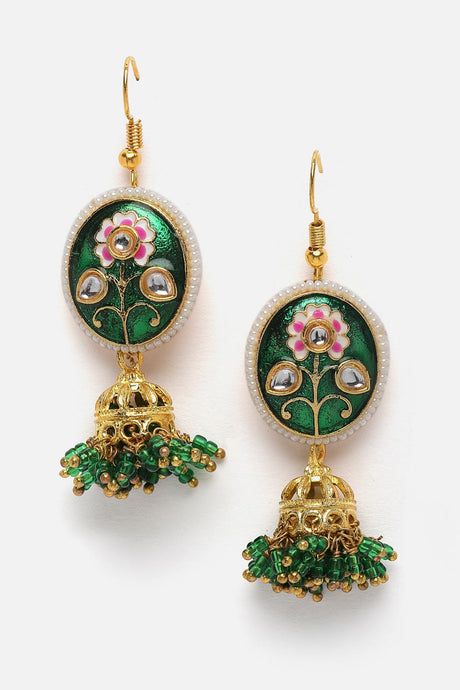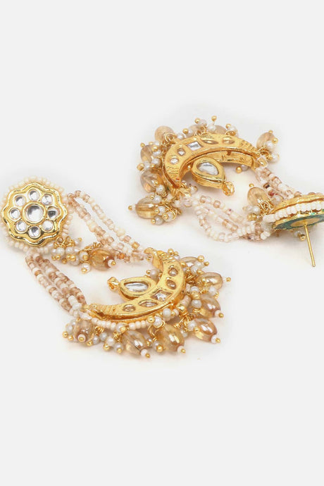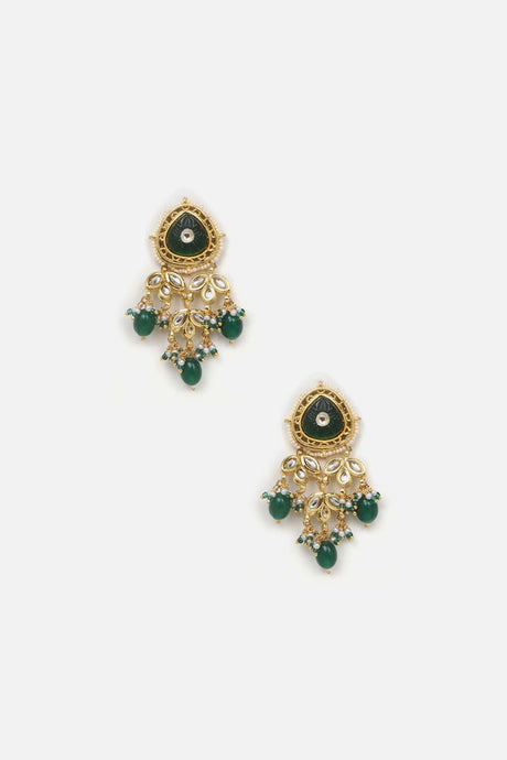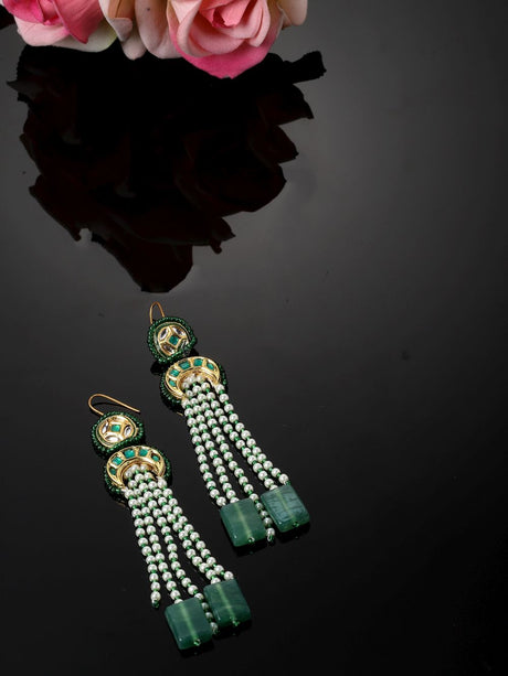 Green And Cream Drop Earring With Kundan, Pearls And Natural Stones