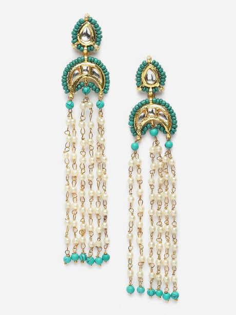 Green, White And Cream Drop Earring With Kundan And Pearls