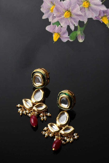 Red And Gold Drop Earring With Kundan And American Diamonds