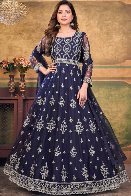 Navy Blue Velvet Embroidered Straight Cut Suits