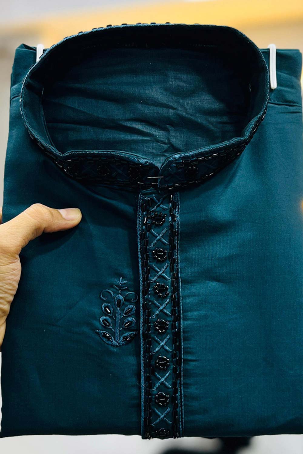 Dress him in elegance with our Kurta Pajama Set, a classic Kurta Set designed for timeless style. Crafted from soft Silk it offers a comfortable fit for all-day wear. The intricate Embroidered on the Kurta adds a traditional touch to this outfit. Perfect for festivewear this Kurta Set is a versatile choice for any festive or formal occasion. Pair it with white churidar pants and traditional juttis for a complete ethnic outfit. Make every moment special with the charm of Kurta and Pajama Set