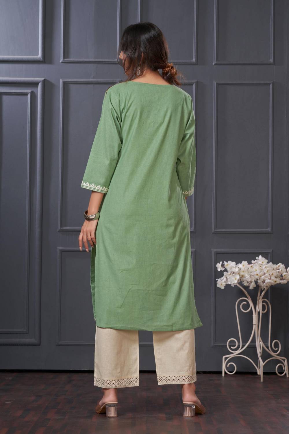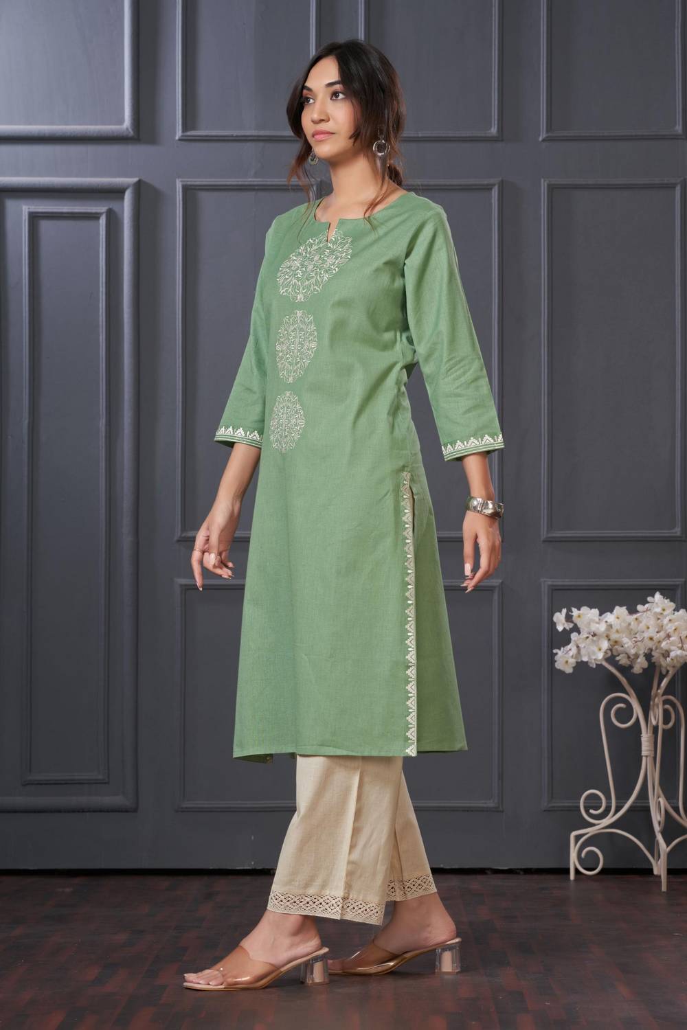 Stay stylish and comfortable with our Kurti Pant Set designed for all-day elegance. Made with Cotton this set is perfect for easy movement and timeless appeal. The beautiful and intricate Embroidered elevates its design for Casual or daily wear, this kurti set is your go-to outfit. Pair it with elegant earrings and kolhapuri sandals or heels for a traditional look or wedges for a modern edge