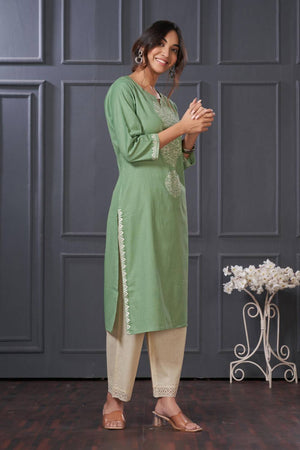 Green Embroidered Cotton Kurti Pant Set