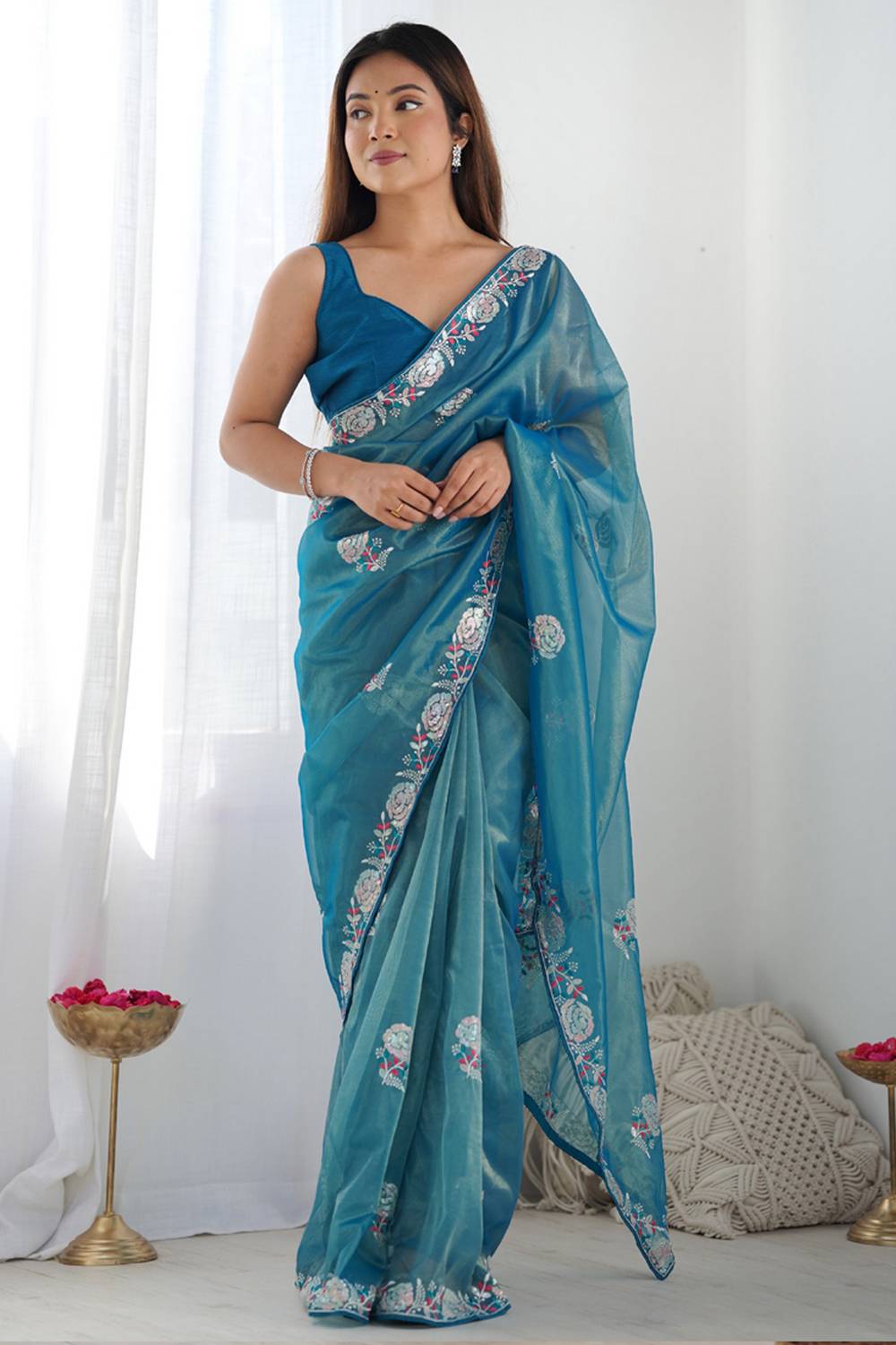 Elevate your wardrobe with our exquisite Saree a masterpiece crafted to add timeless elegance to your style. Made from Organza this saree offers a perfect mix of comfort and sophistication. Adorned with Embroidered it showcases intricate craftsmanship that speaks volumes of tradition and artistry. Perfect for Party this saree is a versatile addition to your collection, ensuring you stand out effortlessly. Pair it with elegant Jewelry, for a glamorous look. Add Clutches or Potli Bags and complete the ensemble with Wedges & Heels , making it a perfect choice for any event. Make a statement and embrace the elegance of Saree today
