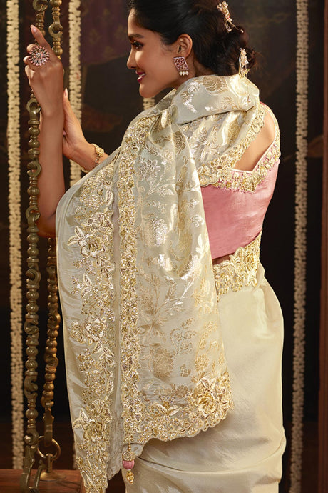 Cream Viscose Resham Embroidery Party Wear Designer Saree