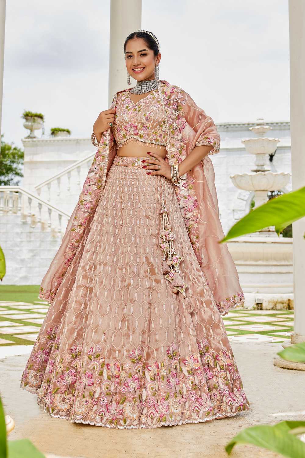 Nude Floral Embriodered Satin Lehenga