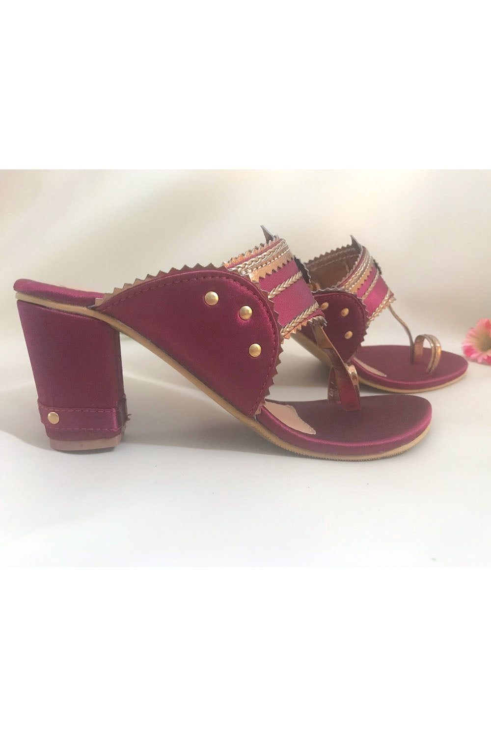 Gem Stone Maroon Satin 3 inch Block Heel Kolapuri with Antique Gold Braiding & Gold Button Detailing .