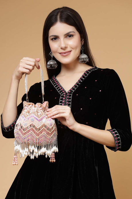 Droop Peach And Multi Chevron Embellished Velvet Potli