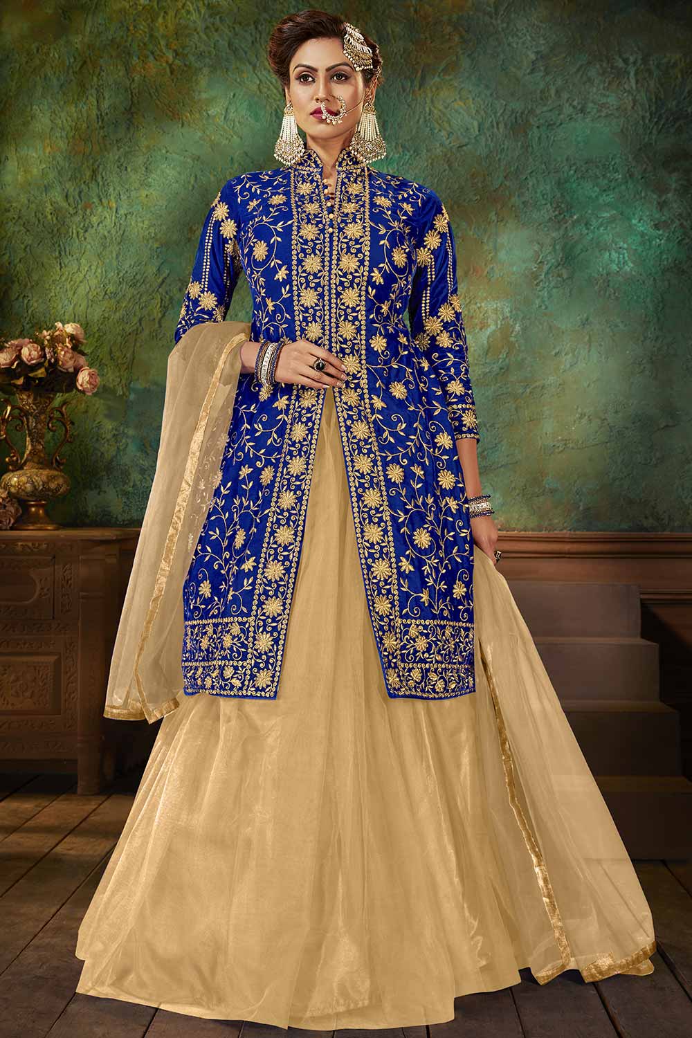 Attractive this designer long length skirt suit in lovely color. Its pretty heavy designer embroidery with stone work top is velvet based paired with net bottom and net fabricated dupatta which gives an attractive to the suit.