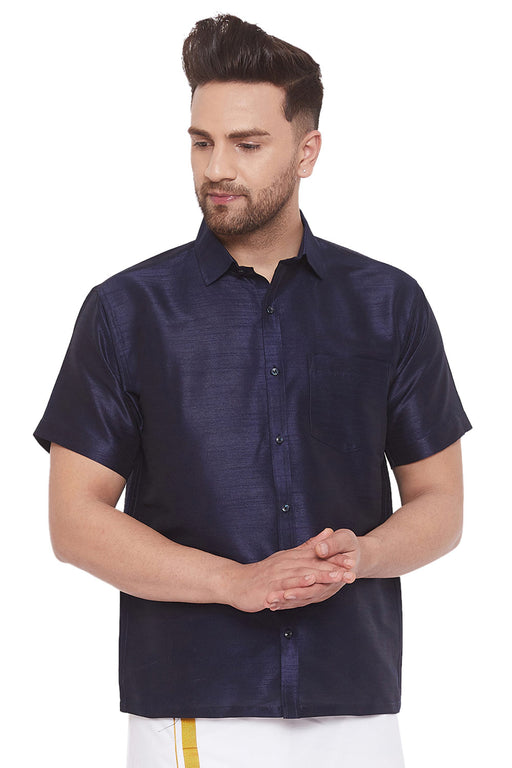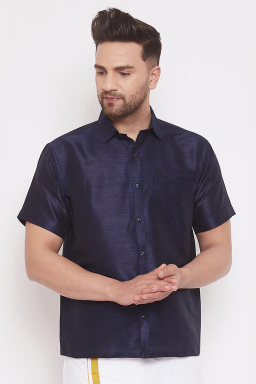 Men's Cotton Art Silk Solid Ethnic Shirt In Blue