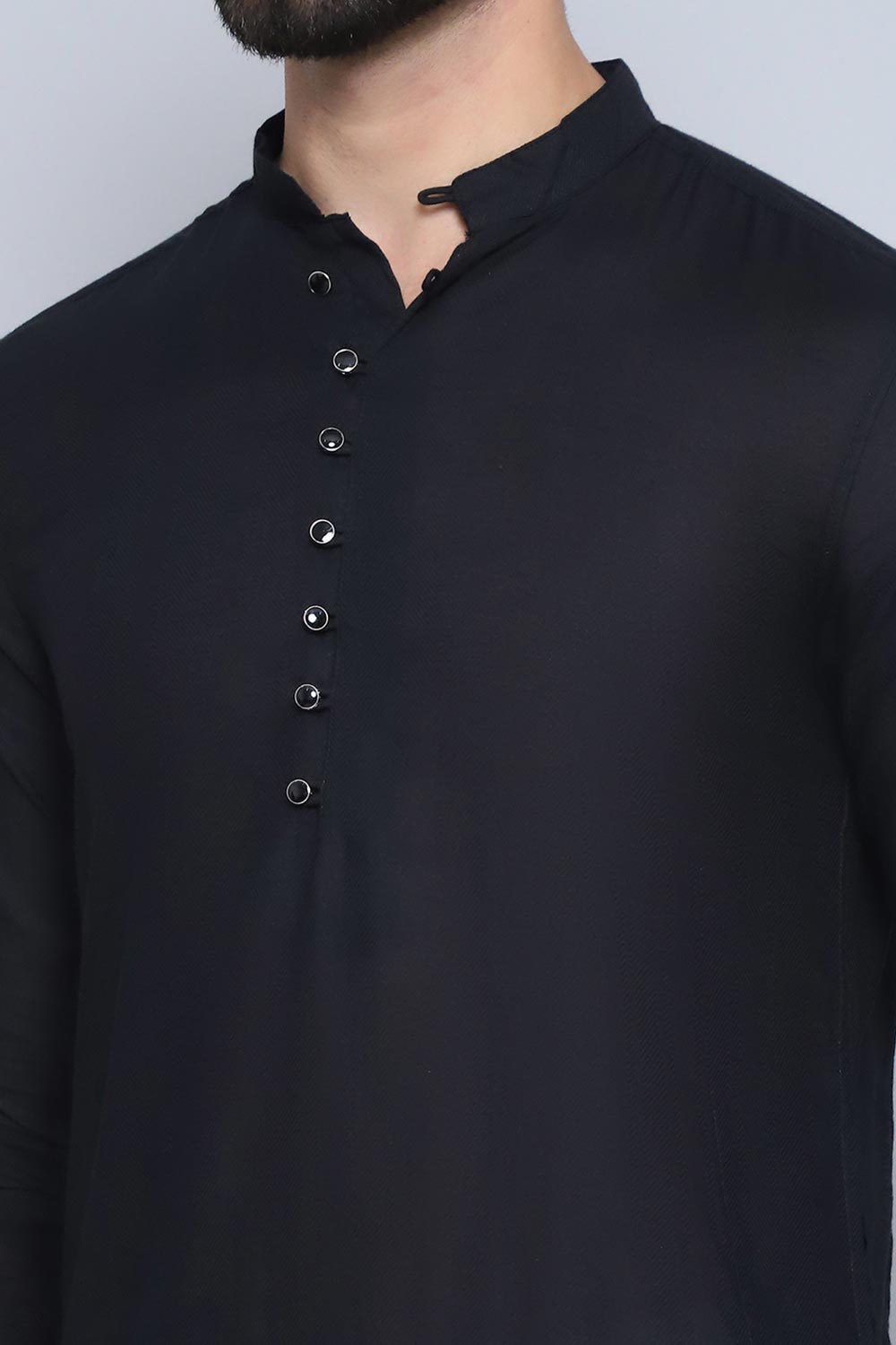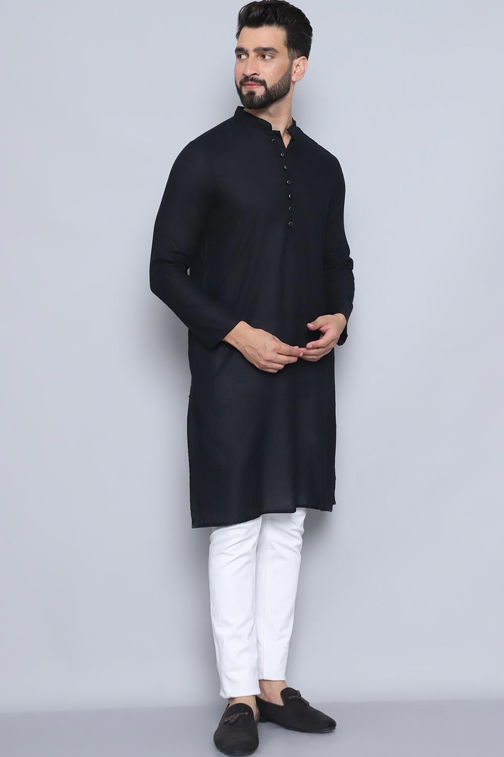 This sleek black cotton solid long kurta offers a sophisticated and versatile addition to your wardrobe.
