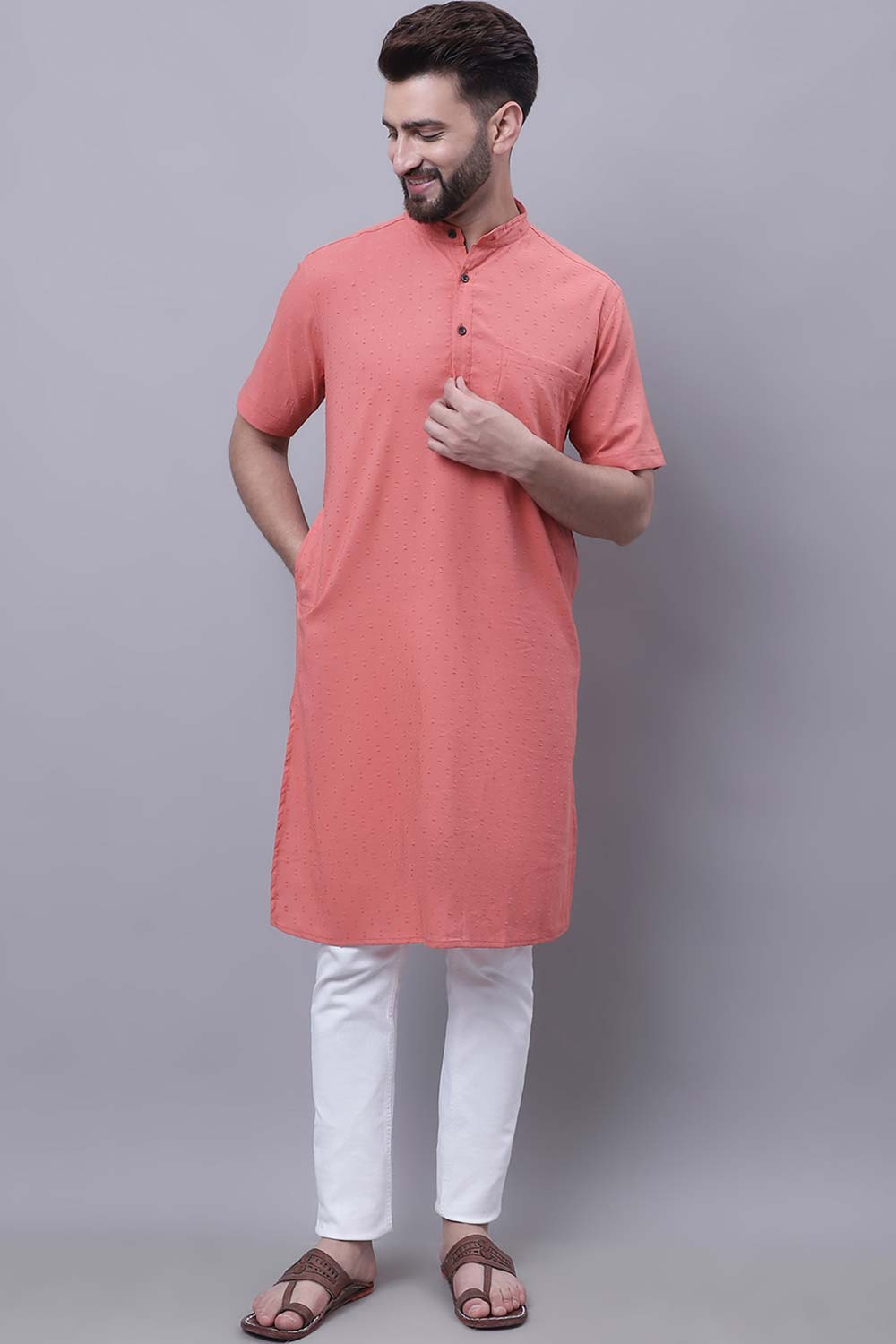 Men's Peach Cotton Long Kurta Top
