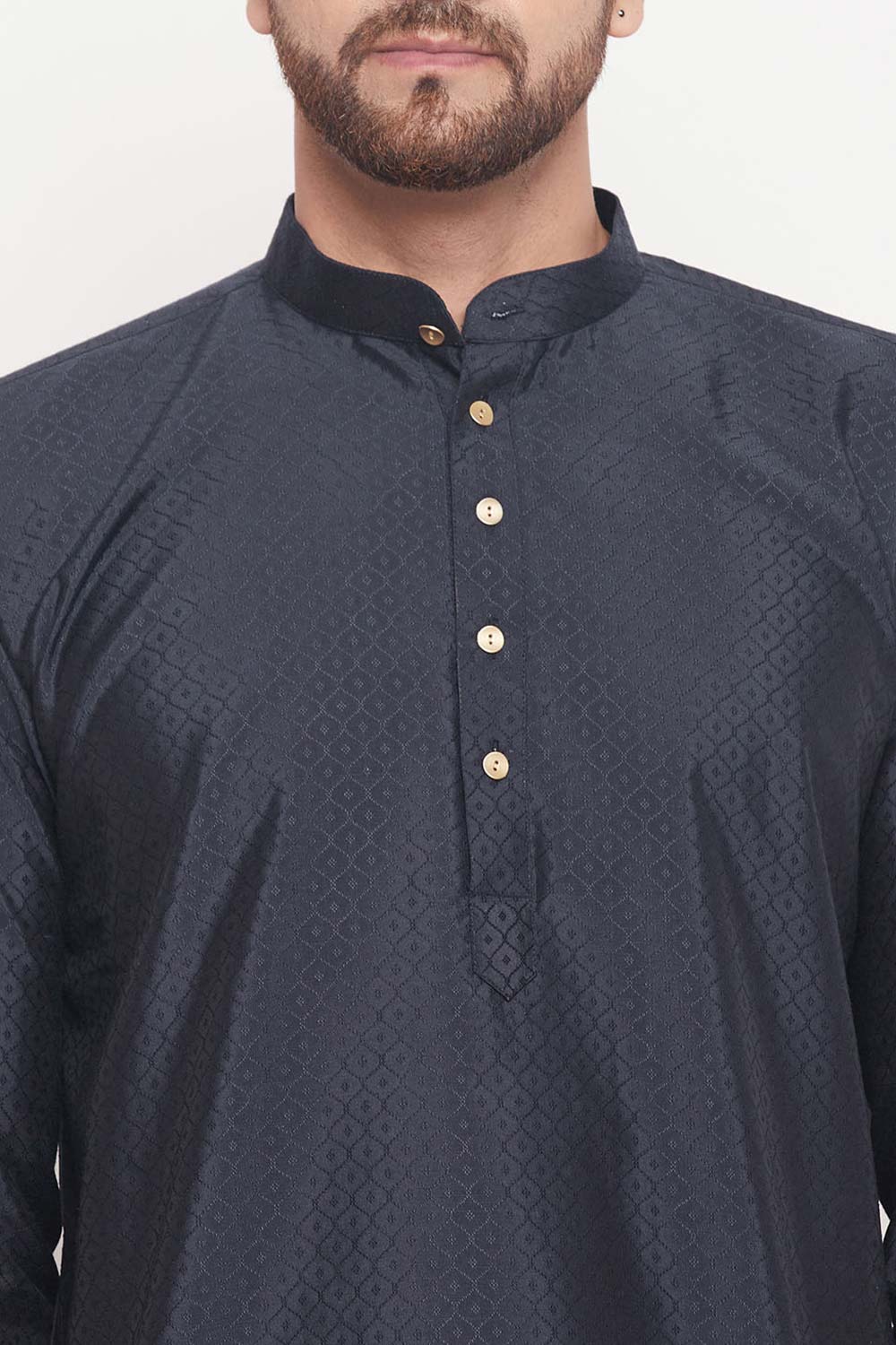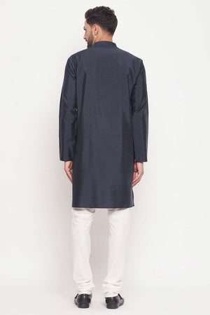 Men's Navy Blue And Cream Silk Blend Ethnic Motif Woven Design Kurta Pajama Set