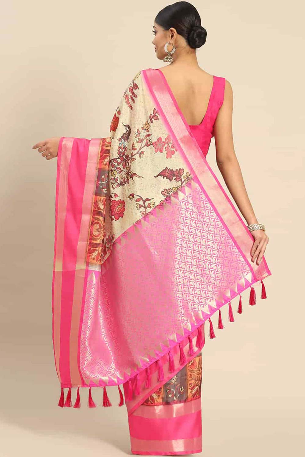 This saree has designed by our designer, it's embellished with the zari all over a saree. It's made with regal weave fabrics along with digital print and woven designs combination for it's beautiful and elegant look. You can wear this saree in party with minimal jewellery and you are ready to GO..!! Saree has a also different type of abstract, kalamkari and floral design, also saree has a contrast border too.