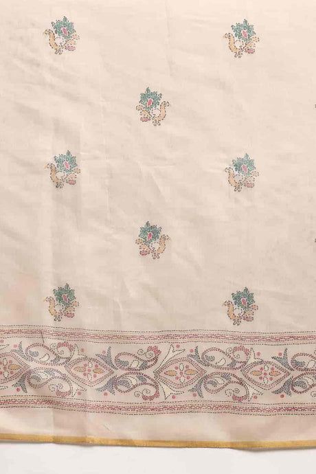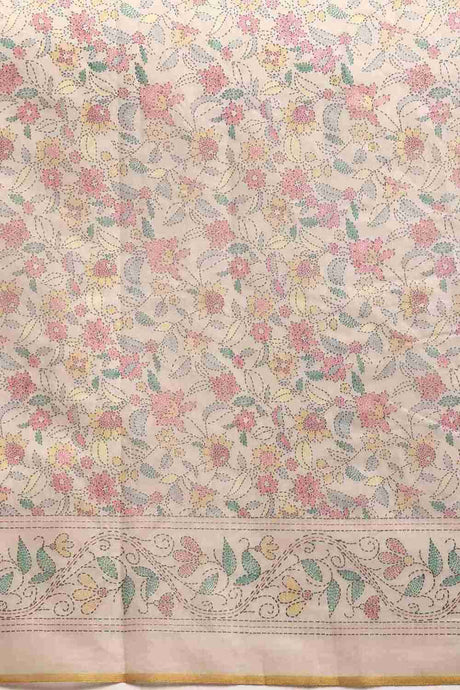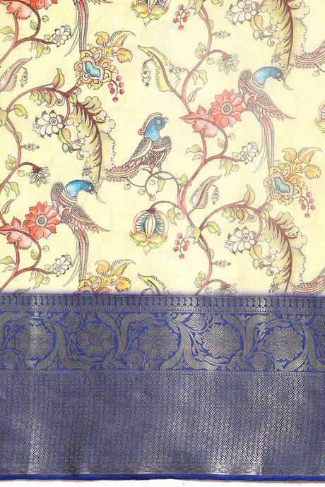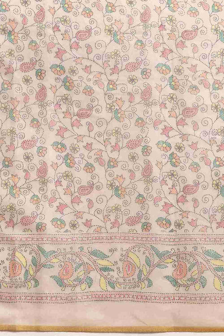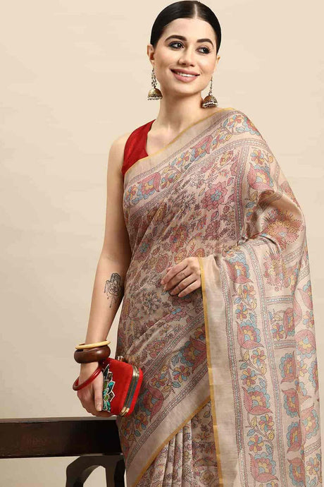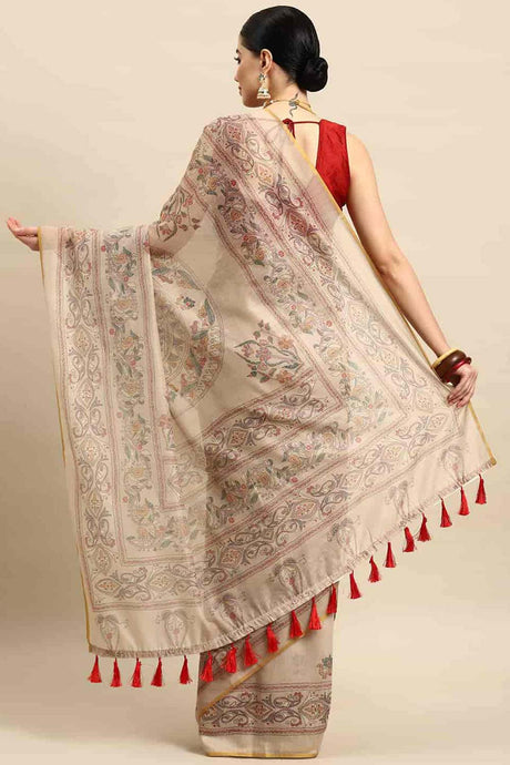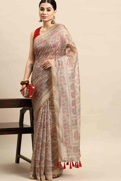 Beige Pichwai Muga Silk Digital Print Saree With Unstitched Blouse Piece