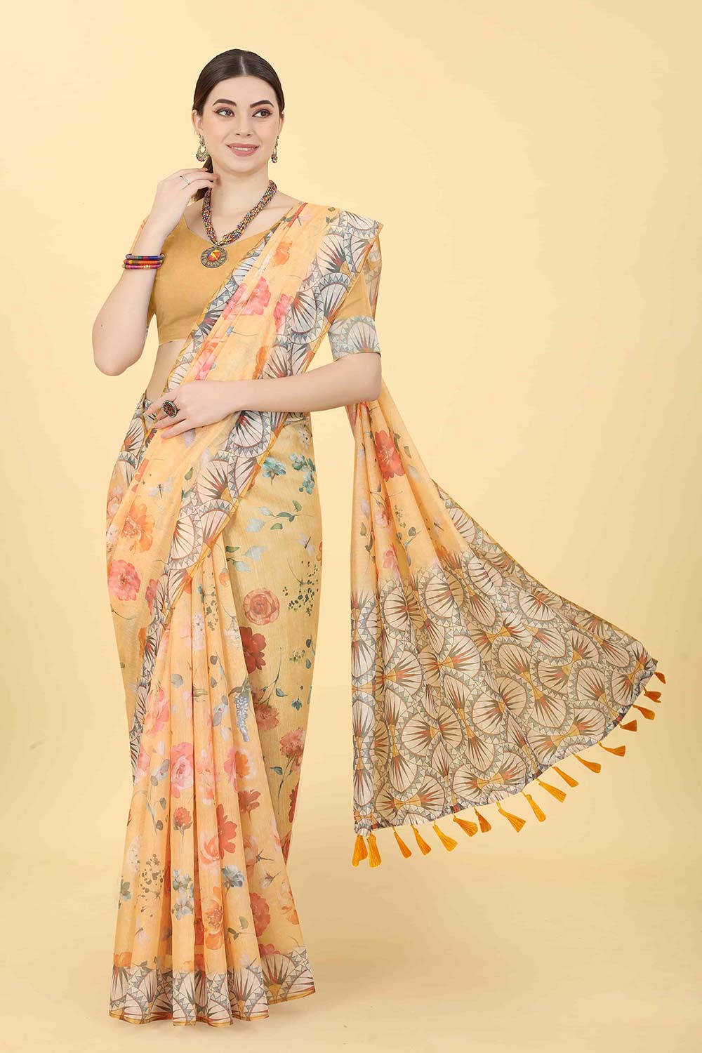 Presenting you Cotton Blend saree with beautiful tassels, available in multiple vibrant colors. Crafted with a lightweight fabric, this saree ensures comfort and ease of movement, making it perfect for parties and special occasions. Embrace its graceful drape and exquisite tassels, adding a touch of charm and glamour to your ensemble.