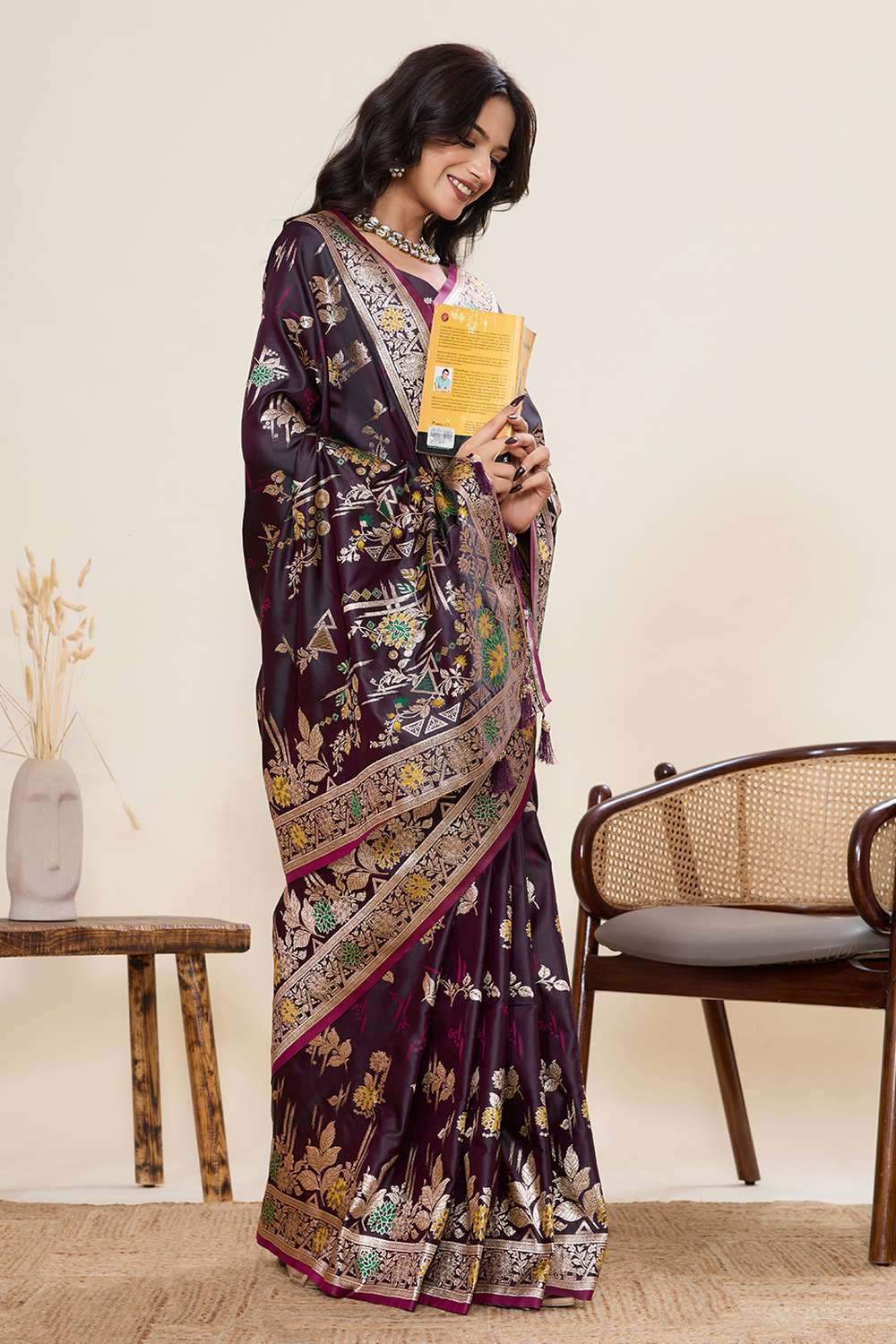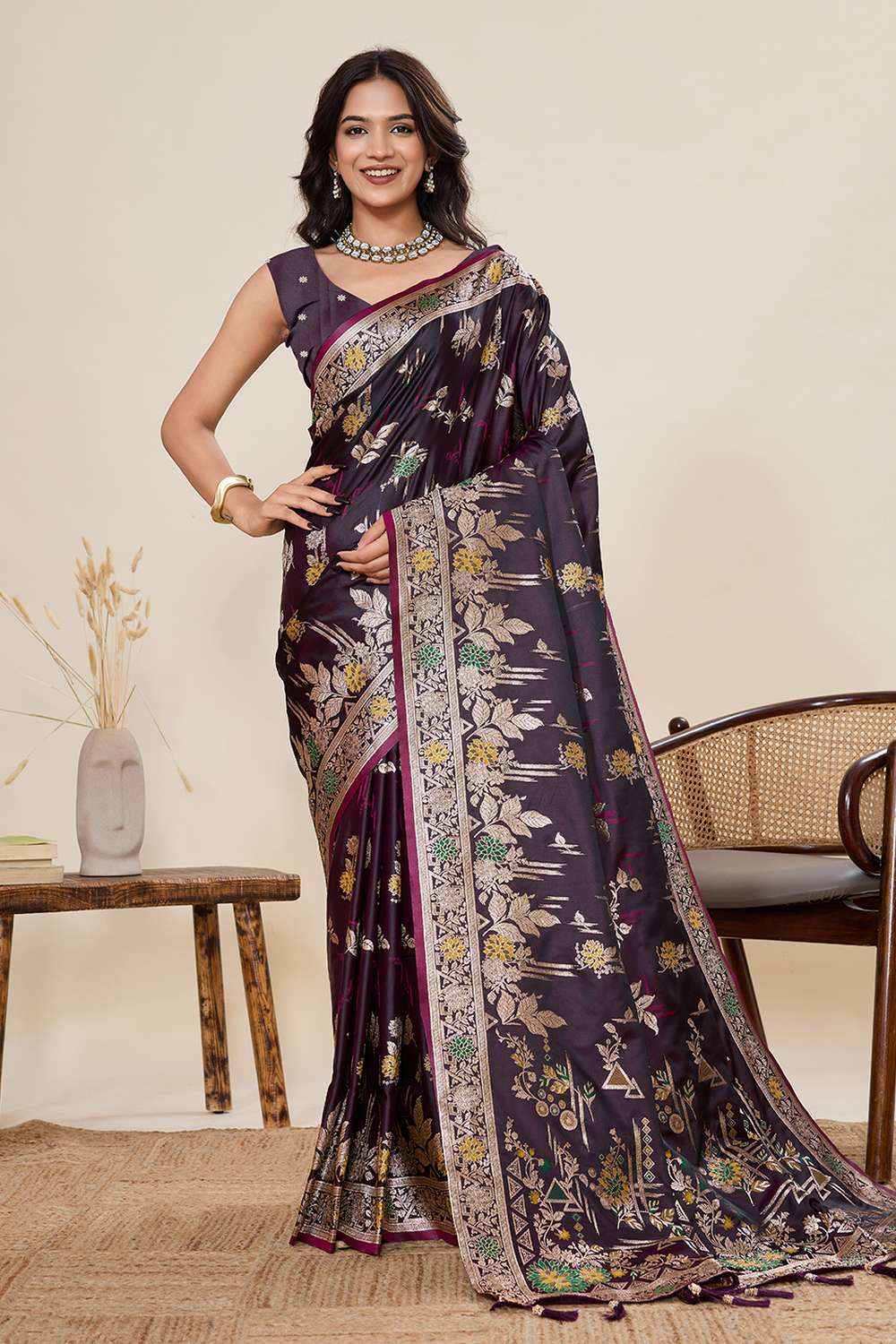 Elevate your wardrobe with our exquisite Saree a masterpiece crafted to add timeless elegance to your style. Made from Two Tone Satin Silk this saree offers a perfect mix of comfort and sophistication. Adorned with Woven it showcases intricate craftsmanship that speaks volumes of tradition and artistry. Perfect for occasion-festivewear this saree is a versatile addition to your collection, ensuring you stand out effortlessly. Pair it with elegant Jewelry, for a glamorous look. Add Clutches or Potli Bags and complete the ensemble with Wedges & Heels , making it a perfect choice for any event. Make a statement and embrace the elegance of Saree today