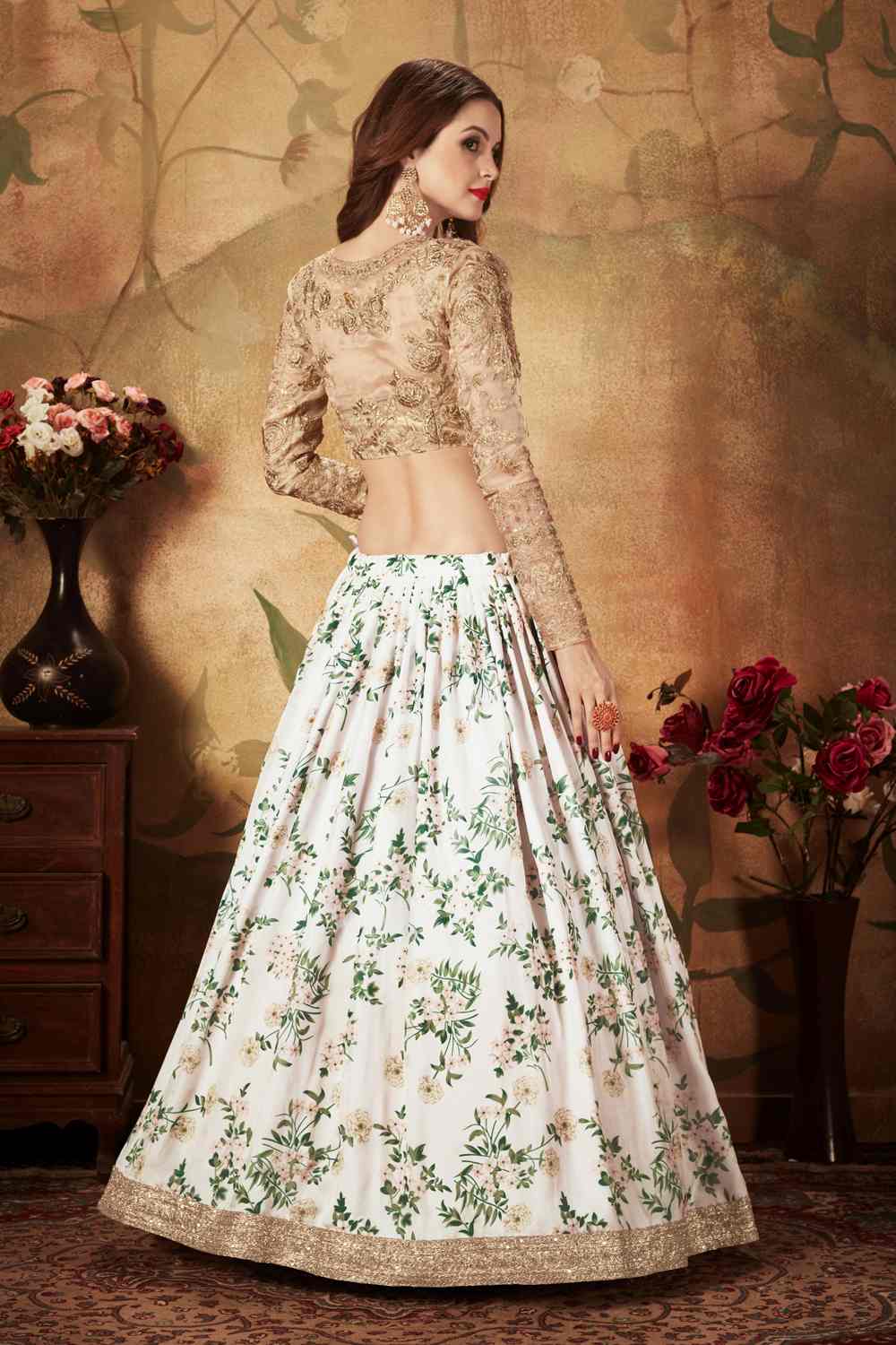 Get ready for the upcoming wedding season with this beautiful designer lehenga choli in beige colored blouse paired with contrasting white colored lehenga and dupatta. Its pretty embroidered blouse is fabricated on organza paired with organza fabricated printed lehenga and dupatta.
