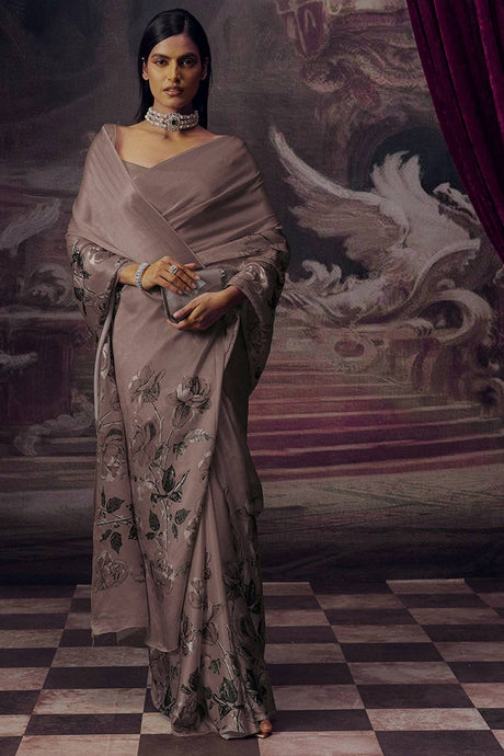 Sale price $53.00 USD Regular price $58.00Unit price /Unavailable Light Grey Floral Printed Satin Saree