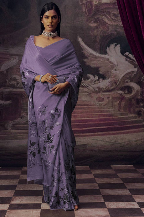 Sale price $53.00 USD Regular price $58.00Unit price /UnavailableLavender Floral Printed Satin Saree