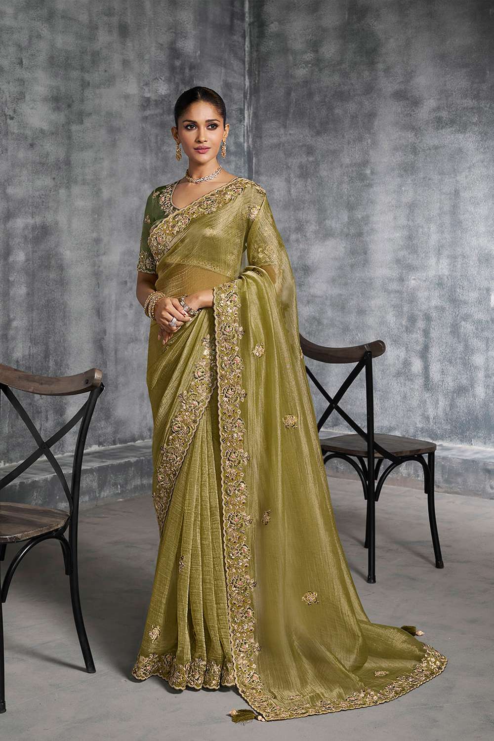 Mehendi Floral Embroidered Tissue Saree