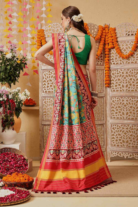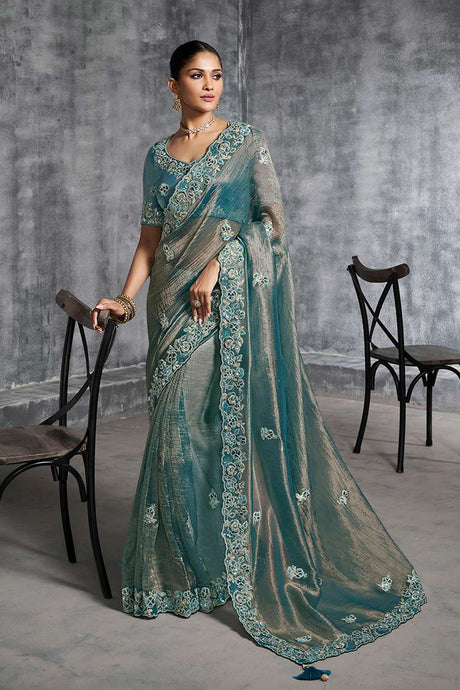 Sale price $173.00 USD Regular price $216.00Unit price /UnavailableTurquoise Floral Embroidered Tissue Saree