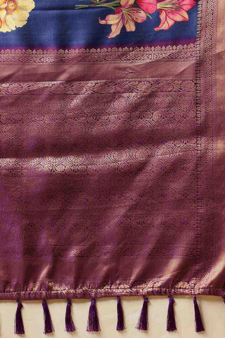 Navy Blue Floral Printed Silk Saree
