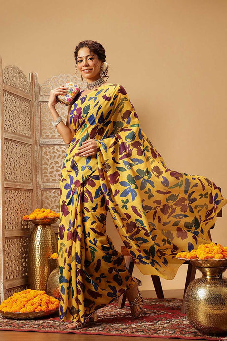 Yellow Floral Printed Malmal Cotton Saree