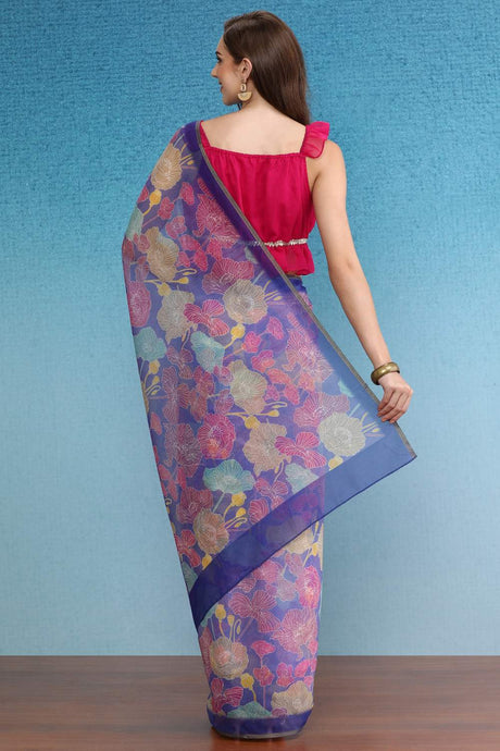Blue Floral Printed Silk Saree