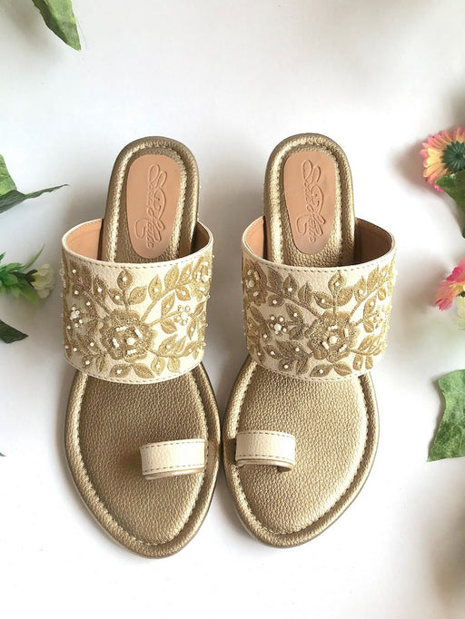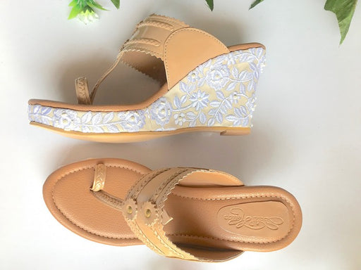 Vegan Leather Kolhapuri Wedges In Cream And Rose Gold