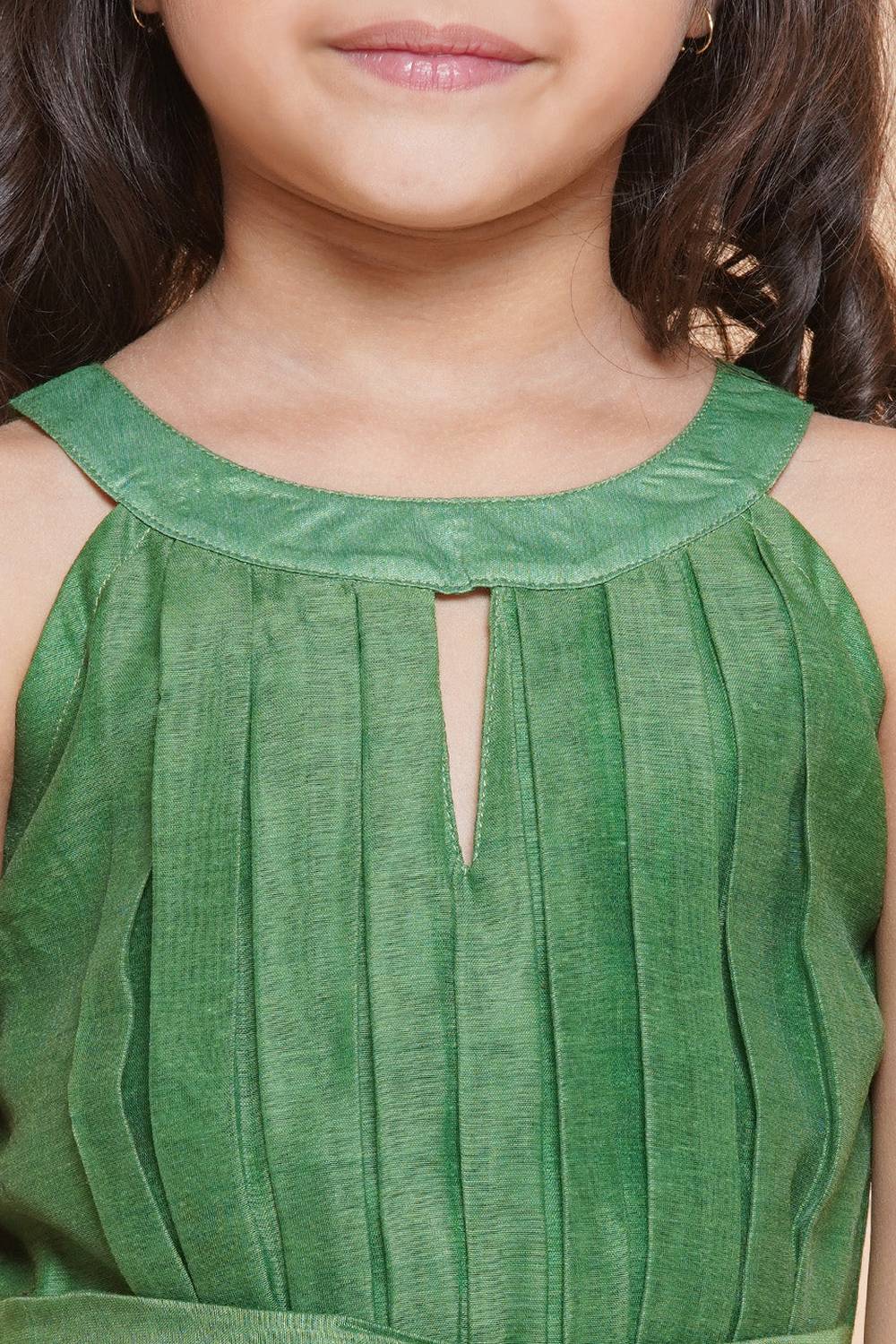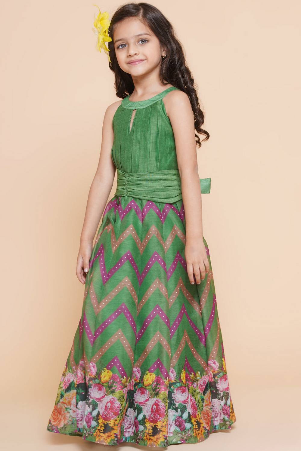 Girl's Green Zig Zag Flower Digital Printed Silk Dress