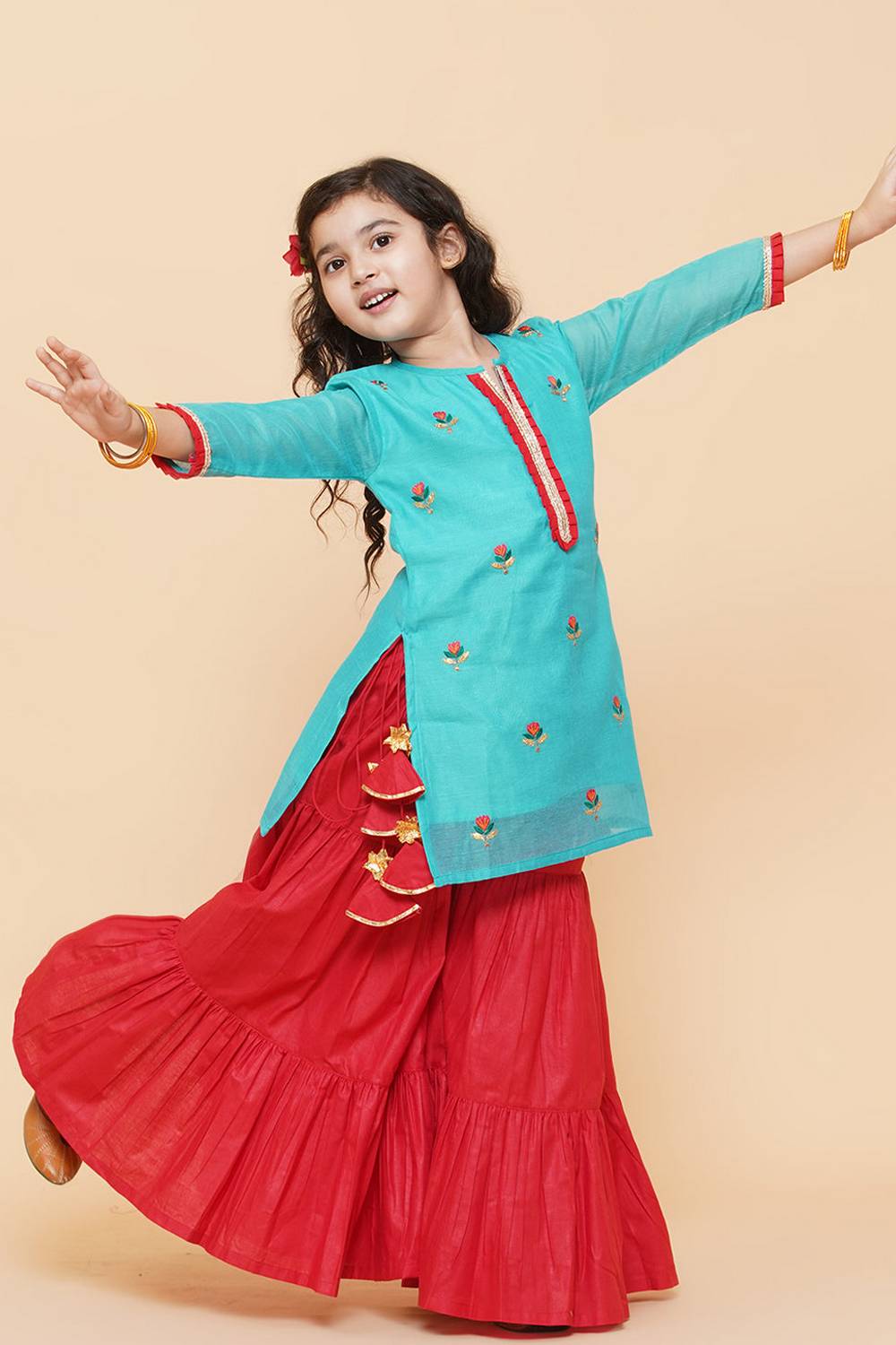 Let her embrace her roots with ourKurta Set an elegant choice for every occasion. Made with soft Cotton this kurta set ensures all-day comfort and freedom of movement. The Embroidered add a charm to this outfit. Perfect for Festive this kurta set is an essential addition to her ethnic wardrobe. Pair it with traditional earrings, colorful bangles, and simple sandals for an adorable look. Add a touch of tradition to her style with the timeless beauty of Kurta Set