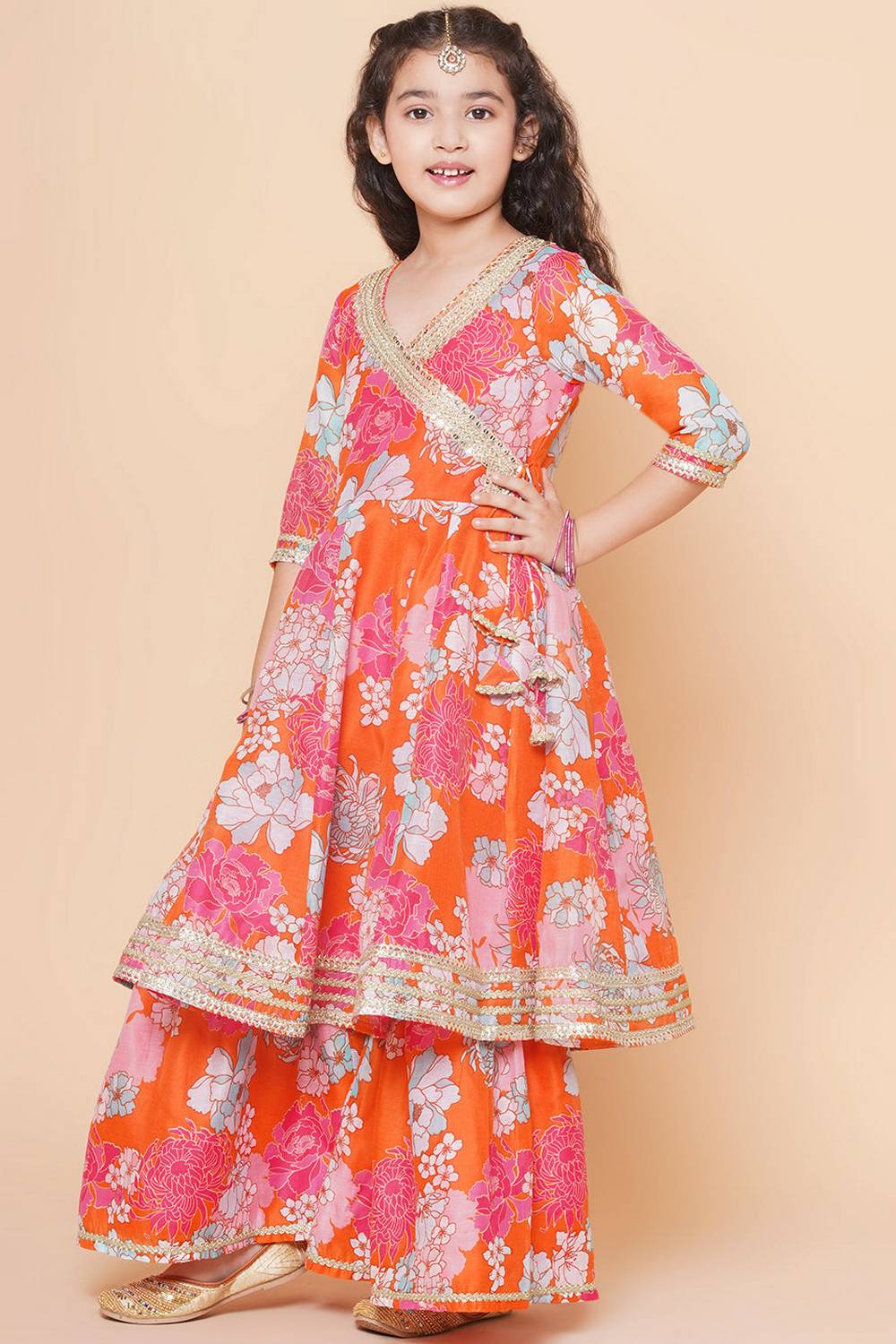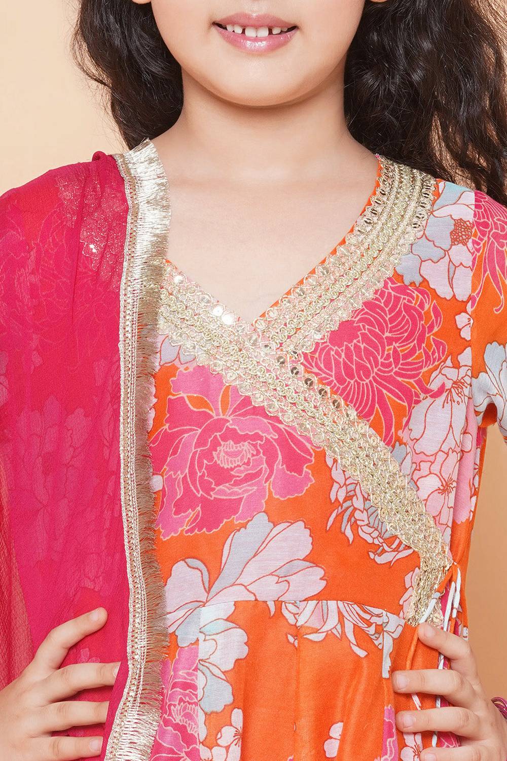 Girl's Orange Floral Printed Silk Kurta Set