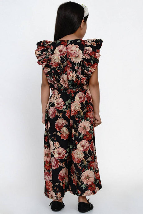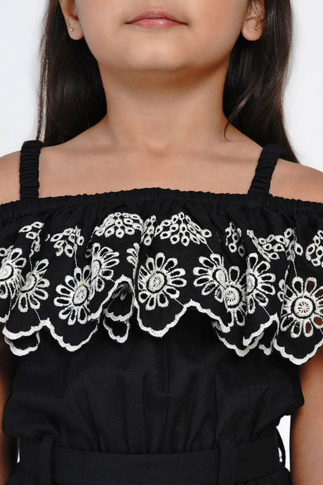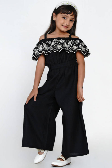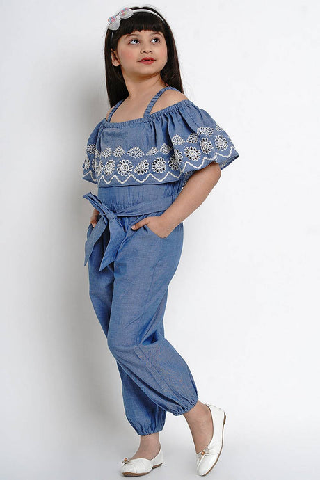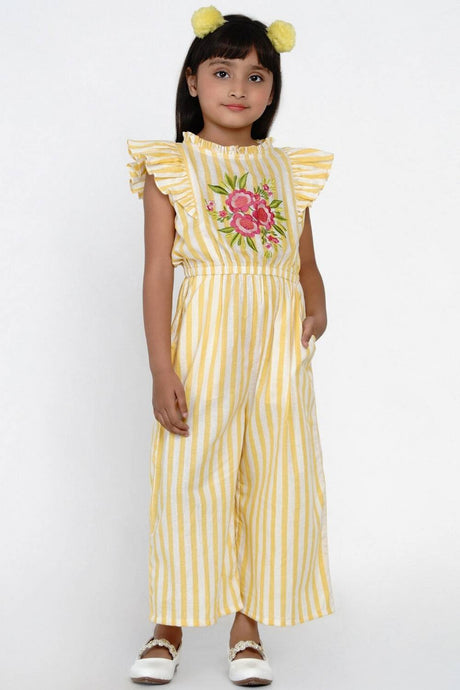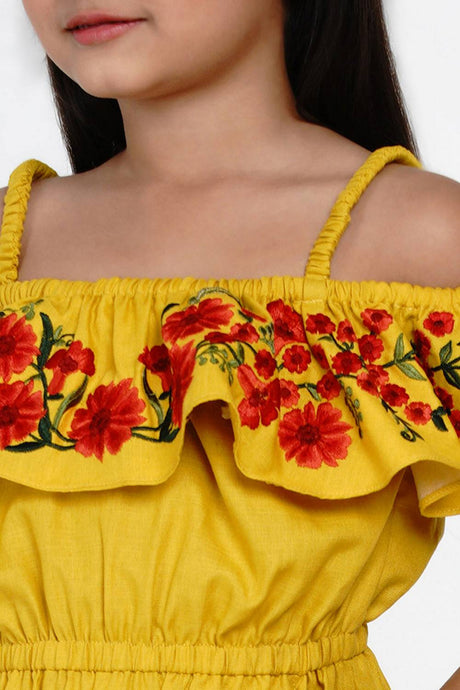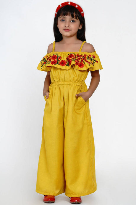 Girl's Mustard Solid With Embroidered Cotton Jumpsuit