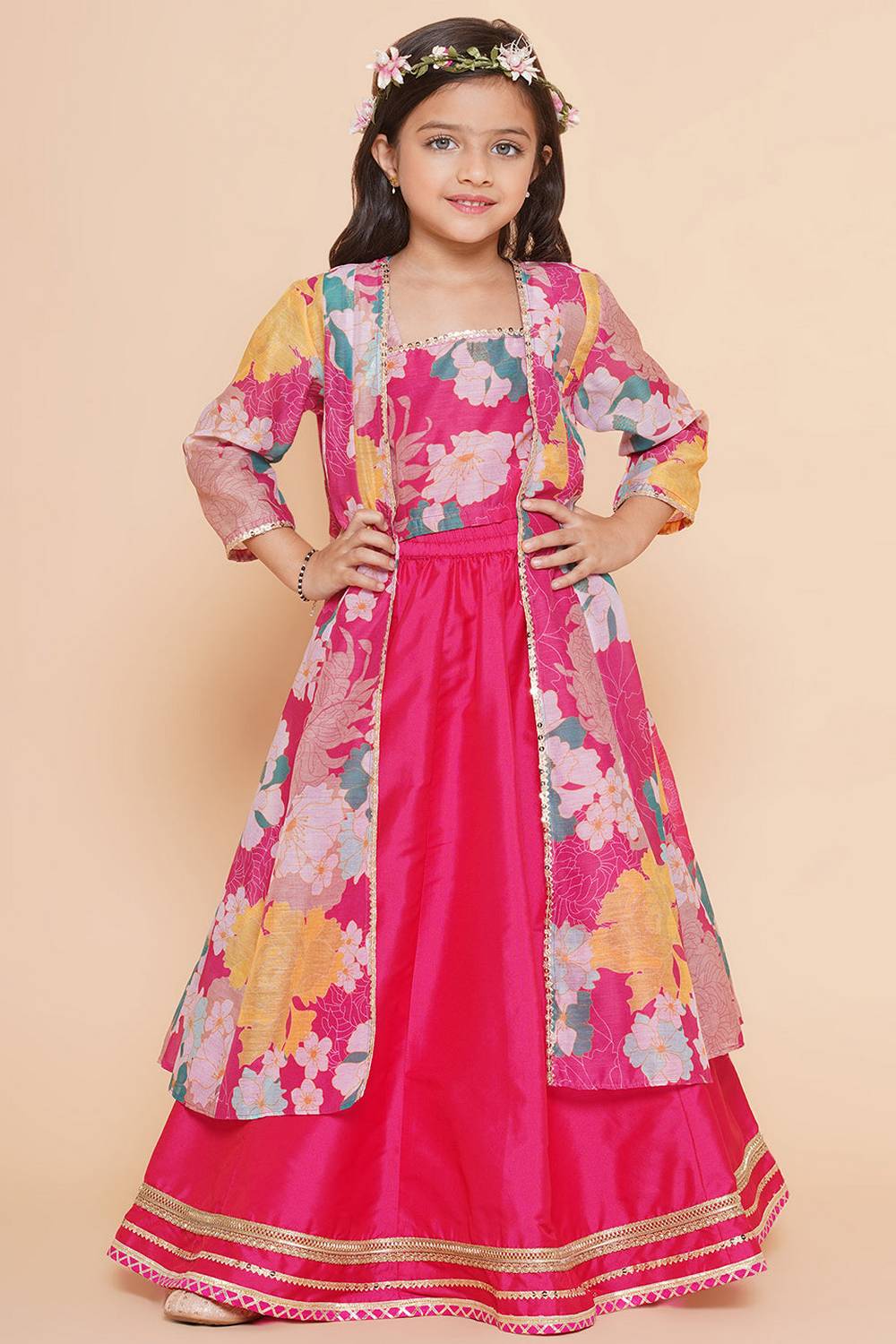 Girl's Pink Floral Printed Silk Lehenga