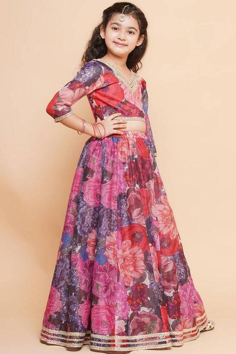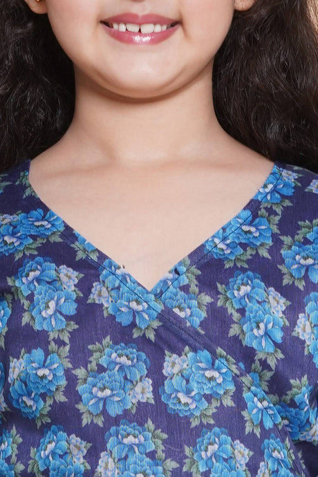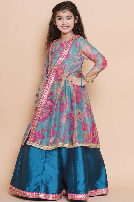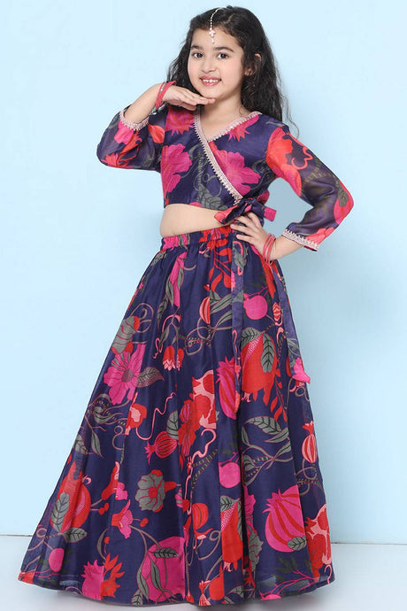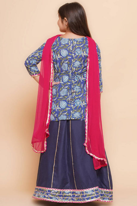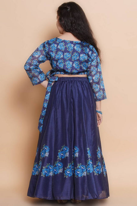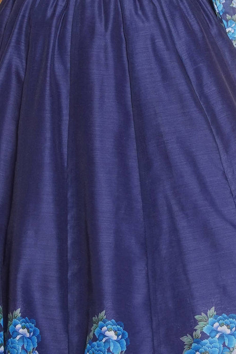 Girl's Navy Blue Floral Printed Silk Lehenga