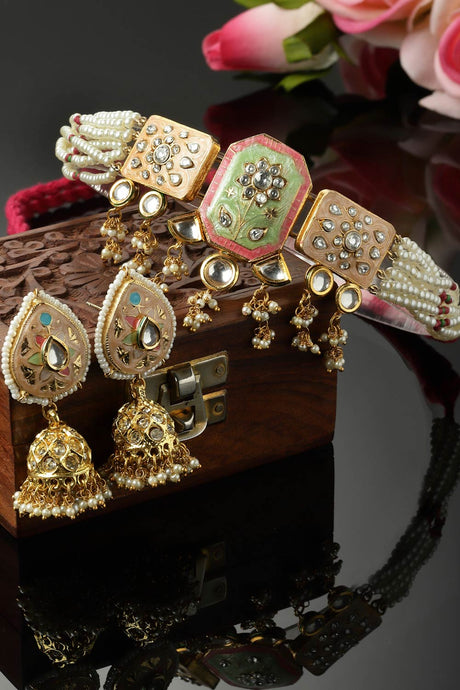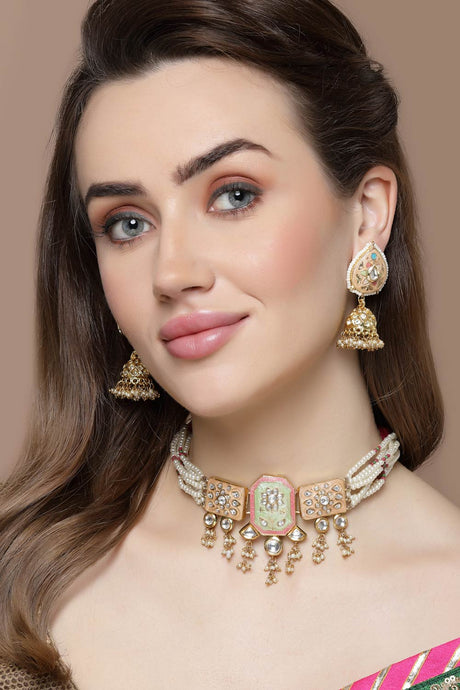 Pink And Green Gold-Plated Kundan And Pearls Choker Necklace