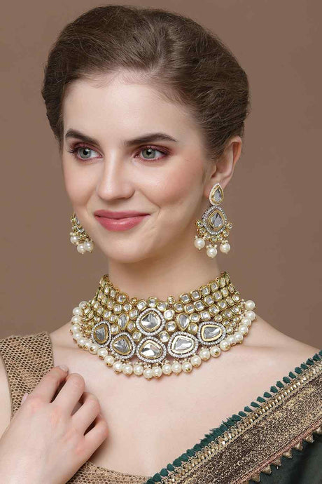 Gold And White Gold-Plated Kundan And Pearls Jewelry Set
