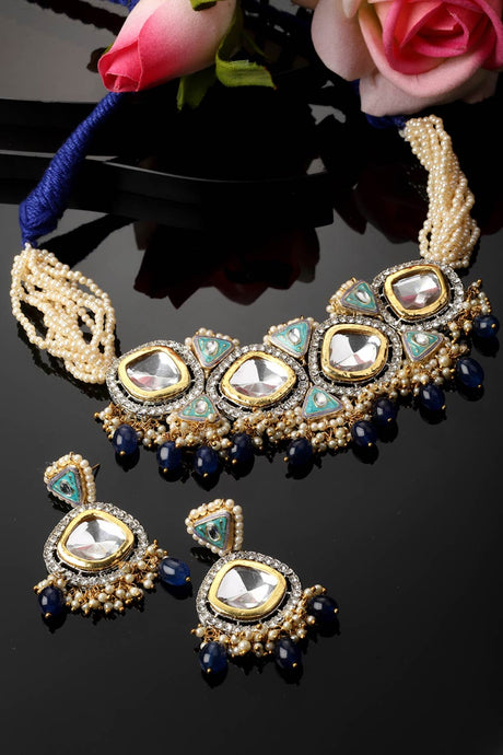 Blue And Cream Gold-Plated Kundan And Pearls Haar Necklace