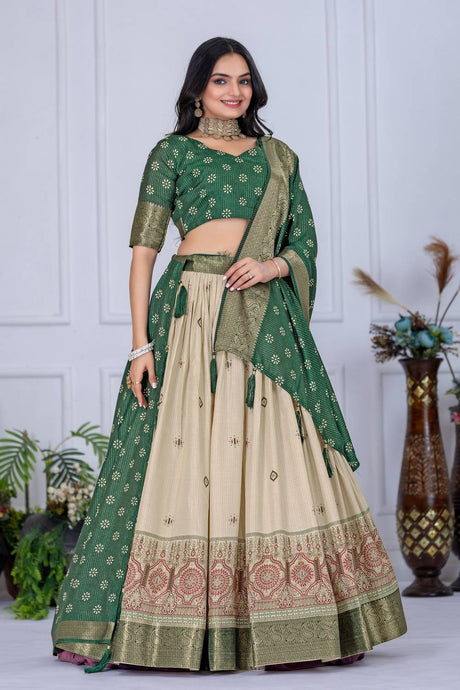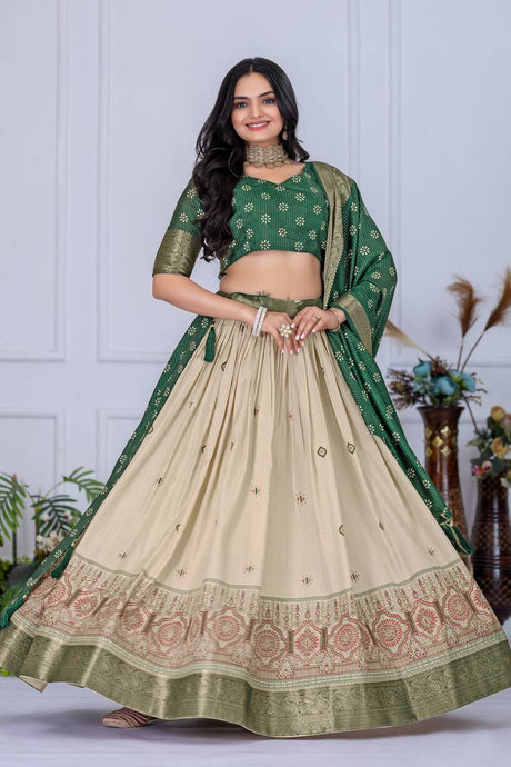 Green Floral Embroidered Lichi Fabric With Jacquard Border Lehenga