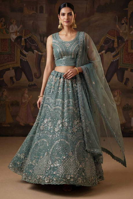 Green Sequin with Embroidered Net Lehenga