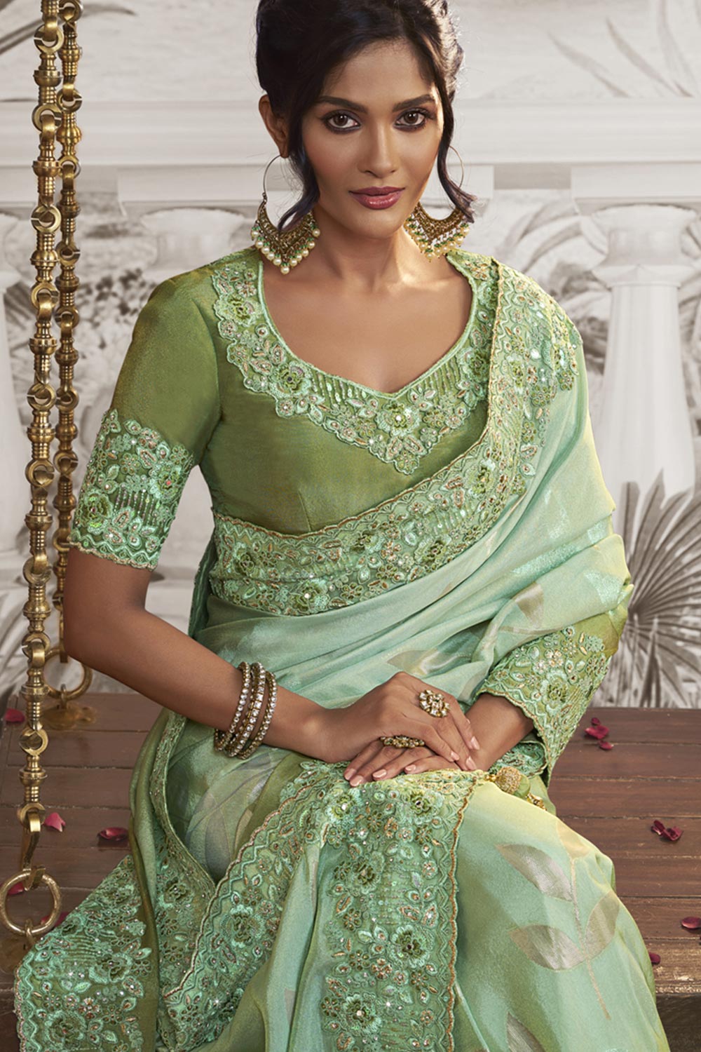 Parrot Green Viscose Resham Embroidery Party Wear Designer Saree