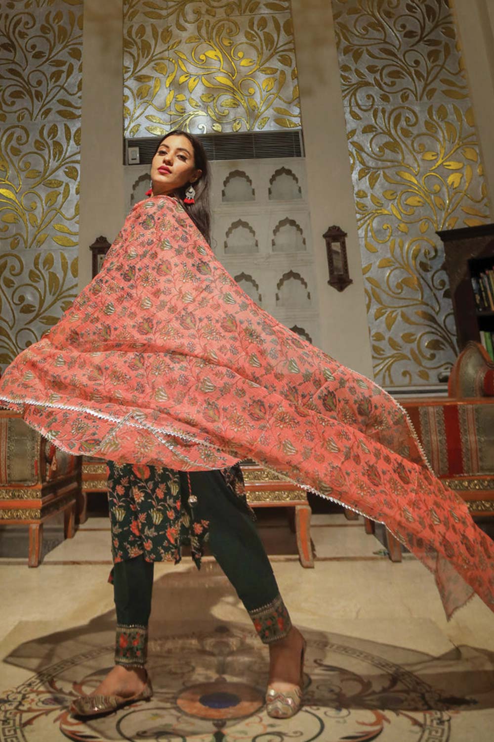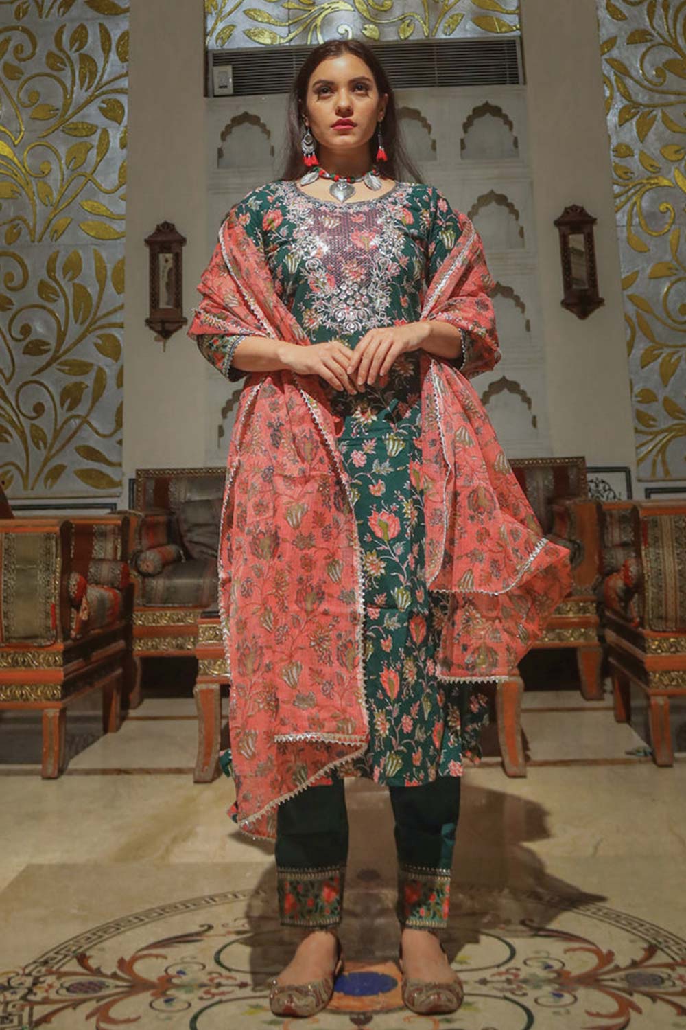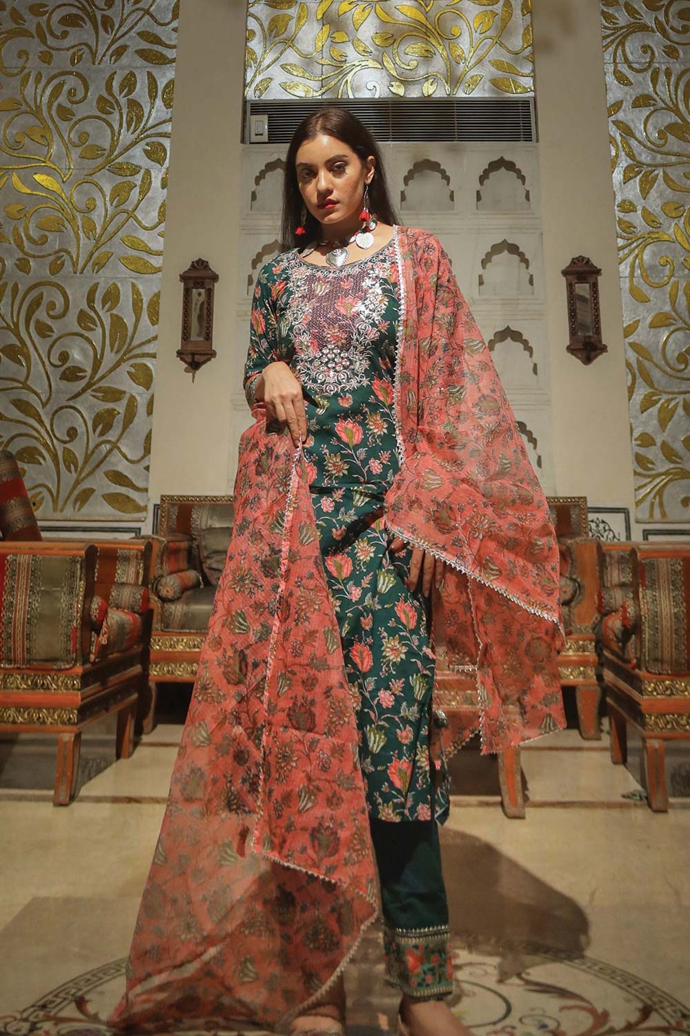 Vibrant Colors Never Fail To Make An Impression, And Our Shades Of Green Suit Set Is Just The Perfect One. The It Has Thread Word on front Round neck and Long Tussles on the Side Slits along With the Solid Pant with Side Pocket, Just makes it Perfect set For Any Outing and doriya Dupatta to add the sheer elegance