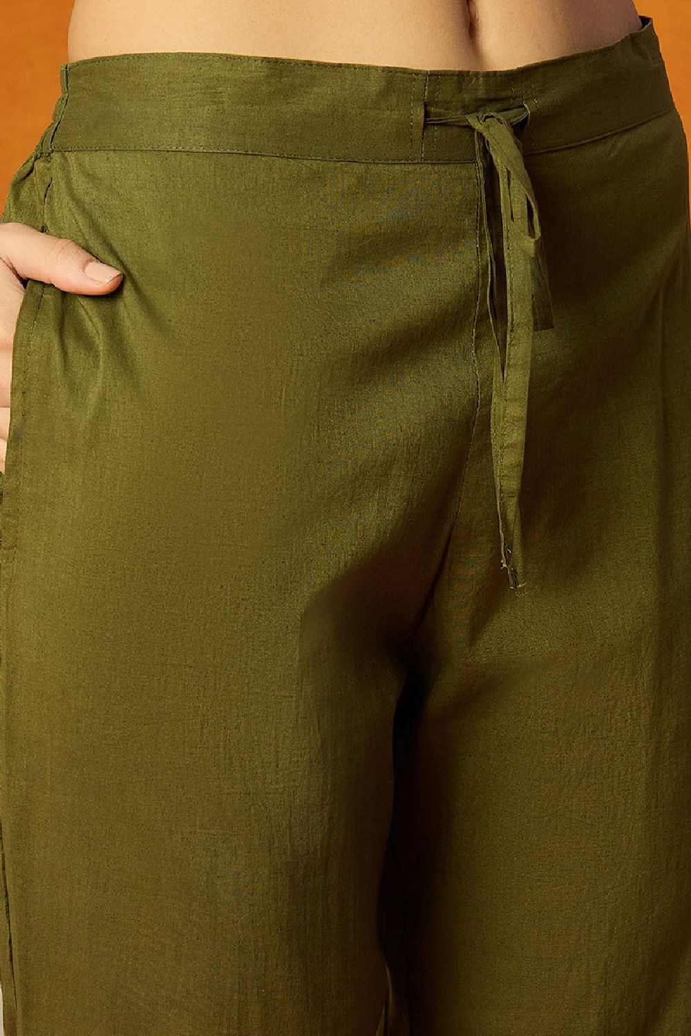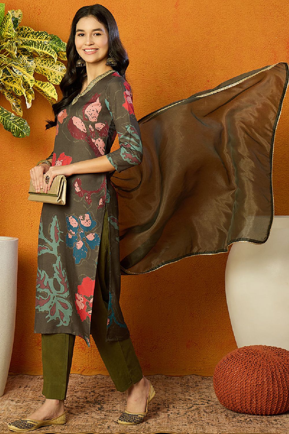 Olive Cotton Blend Floral Printed Straight Cut Suit Set