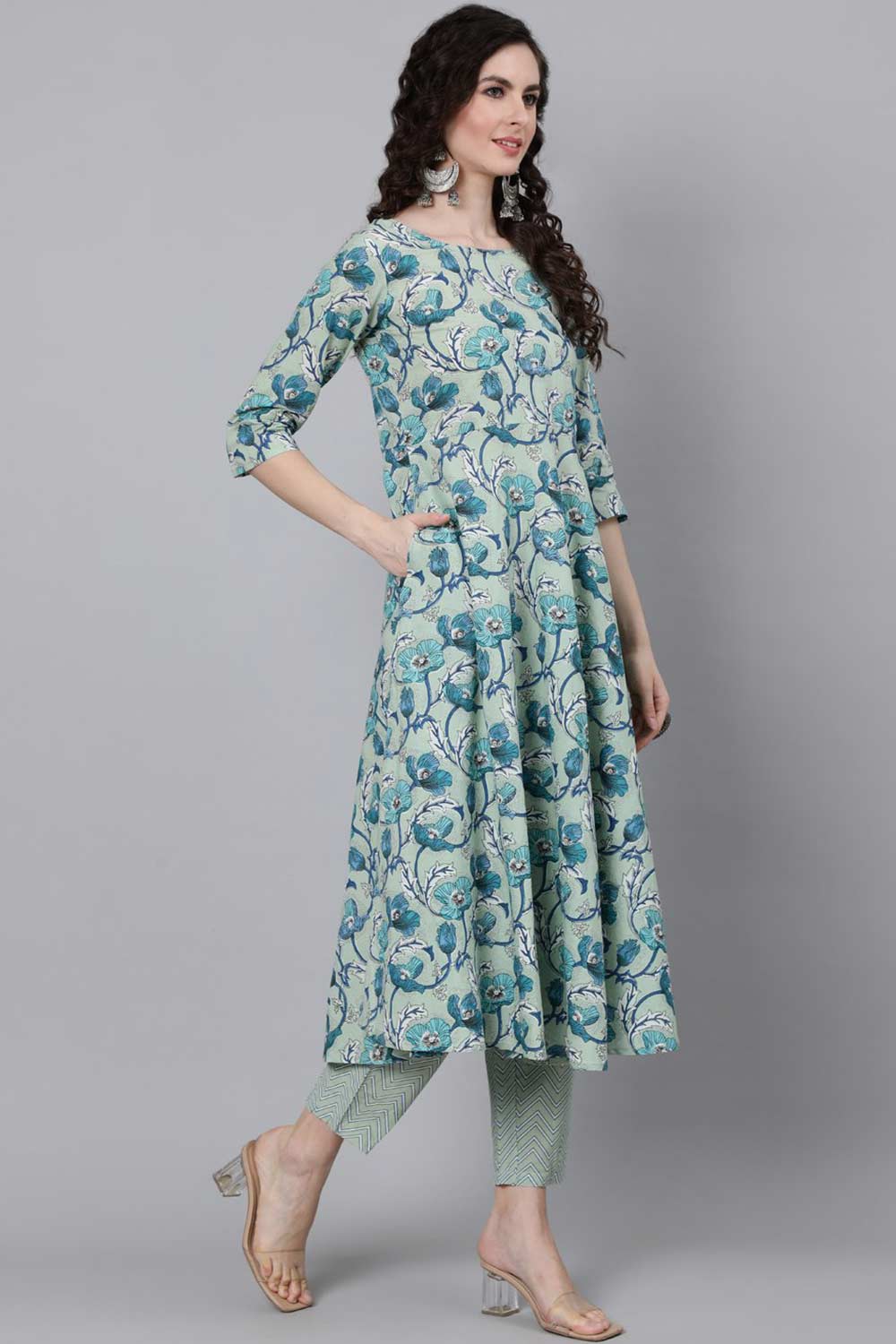 Sage Green Floral Printed Kurta With Trouser And Dupatta